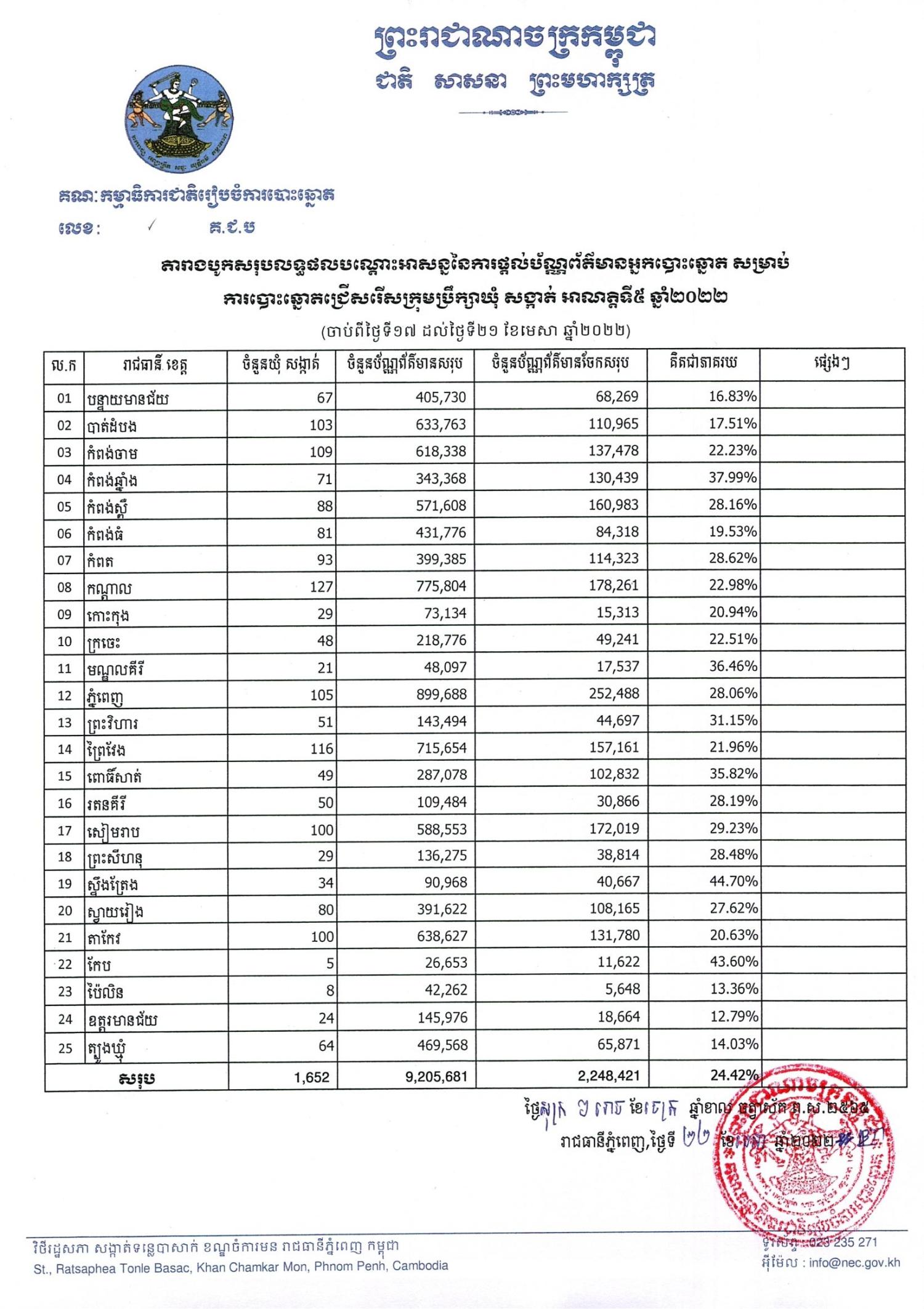 តារាងបូកសរុបលទ្ធផលបណ្ដោះអាសន្ននៃការផ្ដល់ប័ណ្ណព័ត៌មានអ្នកបោះឆ្នោត សម្រាប់ការបោះឆ្នោតជ្រើសរើសក្រុមប្រឹក្សាឃុំ សង្កាត់ អាណត្តិទី៥ ឆ្នាំ២០២២ គិតចាប់ពីថ្ងៃទី១៧ ដល់ថ្ងៃទី២១ ខែមេសា ឆ្នាំ២០២២