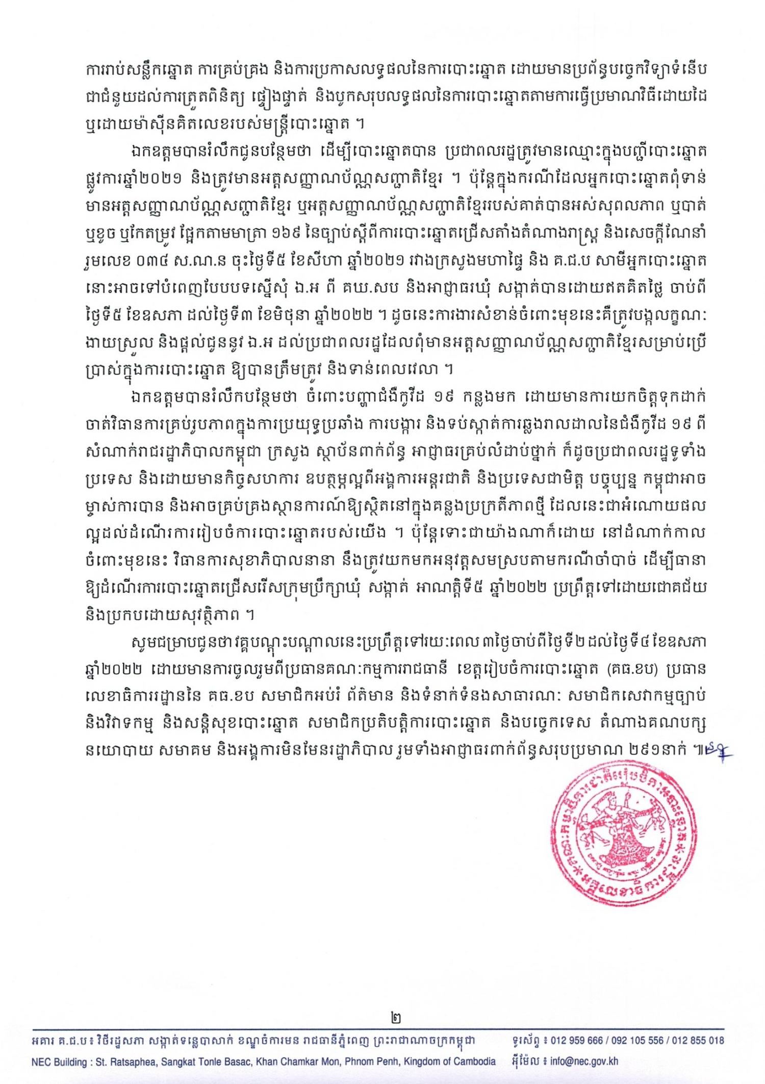 ឯកឧត្តមបានរំលឹកជូនបន្ថែមថា ដើម្បីបោះឆ្នោតបាន ប្រជាពលរដ្ឋត្រូវមានឈ្មោះក្នុងបញ្ជីបោះឆ្នោតផ្លូវការឆ្នាំ២០២១ និងត្រូវមានអត្តសញ្ញាណប័ណ្ណសញ្ជាតិខ្មែរ ។ ប៉ុន្តែក្នុងករណីដែលអ្នកបោះឆ្នោតពុំទាន់មានអត្តសញ្ញាណប័ណ្ណសញ្ជាតិខ្មែរ ឬអត្តសញ្ញាណប័ណ្ណសញ្ជាតិខ្មែររបស់គាត់បានអស់សុពលភាព ឬបាត់ ឬខូច ឬកែតម្រូវ ផ្អែកតាមមាត្រា ១៦៩ នៃច្បាប់ស្តីពីការបោះឆ្នោតជ្រើសតាំងតំណាងរាស្ត្រ និងសេចក្ដីណែនាំរួមលេខ ០៣៤ ស.ណ.ន ចុះថ្ងៃទី៥ ខែសីហា ឆ្នាំ២០២១ រវាងក្រសួងមហាផ្ទៃ និង គ.ជ.ប សាមីអ្នកបោះឆ្នោតនោះអាចទៅបំពេញបែបបទស្នើសុំ ឯ.អ ពី គឃ.សប និងអាជ្ញាធរឃុំ សង្កាត់បានដោយឥតគិតថ្លៃ ចាប់ពីថ្ងៃទី៥ ខែឧសភា ដល់ថ្ងៃទី៣ ខែមិថុនា ឆ្នាំ២០២២ ។ ដូចនេះការងារសំខាន់ចំពោះមុខនេះគឺត្រូវបង្កលក្ខណៈងាយស្រួល និងផ្តល់ជូននូវ ឯ.អ ដល់ប្រជាពលរដ្ឋដែលពុំមានអត្តសញ្ញាណប័ណ្ណសញ្ជាតិខ្មែរសម្រាប់ប្រើប្រាស់ក្នុងការបោះឆ្នោត ឱ្យបានត្រឹមត្រូវ និងទាន់ពេលវេលា ។