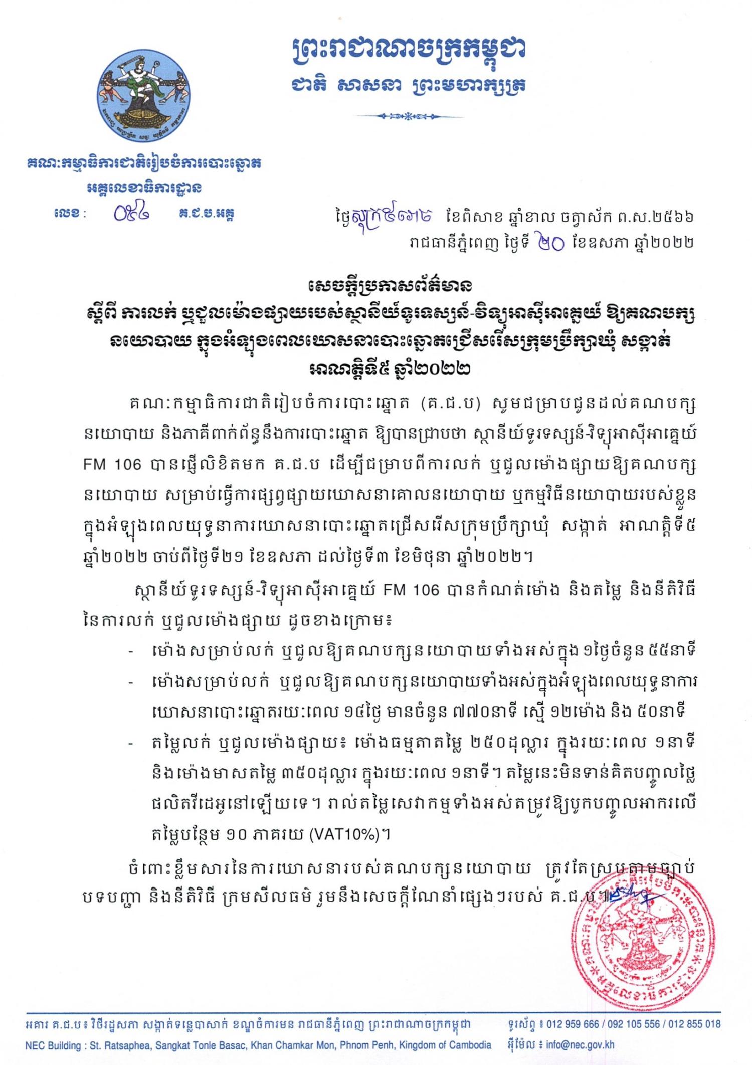 គណៈកម្មាធិការជាតិរៀបចំការបោះឆ្នោត (គ.ជ.ប) សូមជម្រាបជូនដល់គណបក្សនយោបាយ និងភាគីពាក់ព័ន្ធនឹងការបោះឆ្នោត ឱ្យបានជ្រាបថា ស្ថានីយ៍ទូរទស្សន៍-វិទ្យុអាស៊ីអាគ្នេយ៍ FM 106 បានផ្ញើលិខិតមក គ.ជ.ប ដើម្បីជម្រាបពីការលក់ ឬជួលម៉ោងផ្សាយឱ្យគណបក្សនយោបាយ សម្រាប់ធ្វើការផ្សព្វផ្សាយឃោសនាគោលនយោបាយ ឬកម្មវិធីនយោបាយរបស់ខ្លួន ក្នុងអំឡុងពេលយុទ្ធនាការឃោសនាបោះឆ្នោតជ្រើសរើសក្រុមប្រឹក្សាឃុំ សង្កាត់ អាណត្តិទី៥ ឆ្នាំ២០២២ ចាប់ពីថ្ងៃទី២១ ខែឧសភា ដល់ថ្ងៃទី៣ ខែមិថុនា ឆ្នាំ២០២២។