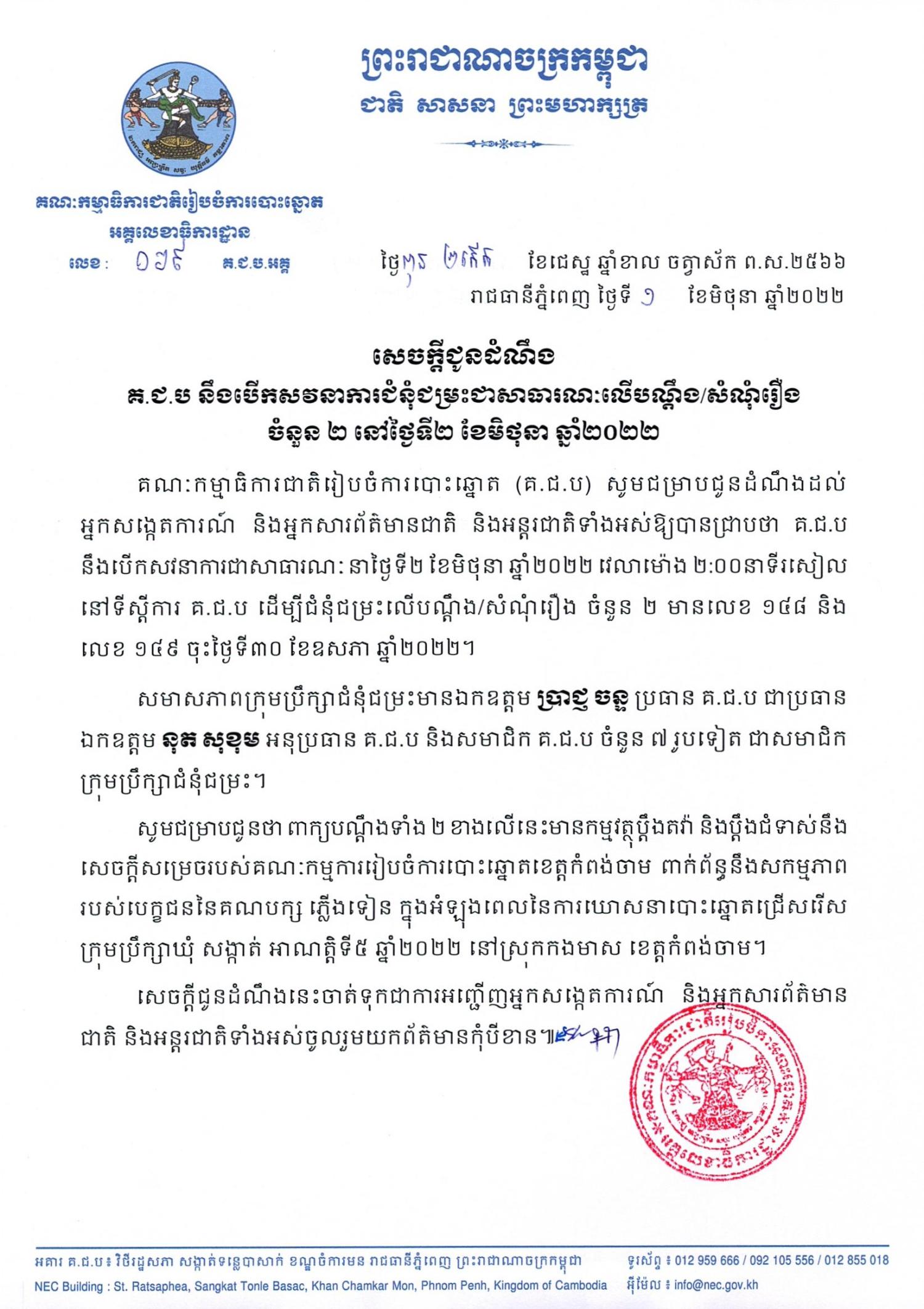 គណៈកម្មាធិការជាតិរៀបចំការបោះឆ្នោត (គ.ជ.ប) សូមជម្រាបជូនដំណឹងដល់អ្នកសង្កេតការណ៍ និងអ្នកសារព័ត៌មានជាតិ និងអន្តរជាតិទាំងអស់ឱ្យបានជ្រាបថា គ.ជ.ប នឹងបើកសវនាការជាសាធារណៈ នាថ្ងៃទី២ ខែមិថុនា ឆ្នាំ២០២២ វេលាម៉ោង ២:០០នាទីរសៀល នៅទីស្ដីការ គ.ជ.ប ដើម្បីជំនុំជម្រះលើបណ្ដឹង/សំណុំរឿង ចំនួន ២ មានលេខ ១៤៨ និងលេខ ១៤៩ ចុះថ្ងៃទី៣០ ខែឧសភា ឆ្នាំ២០២២។