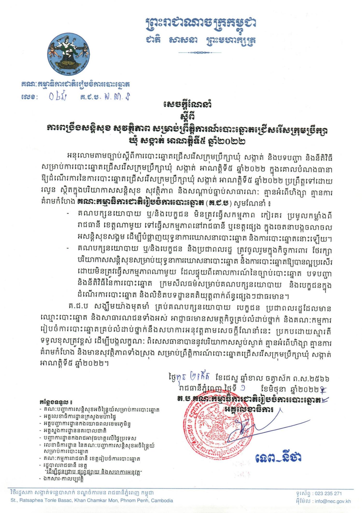 សេចក្ដីណែនាំ លេខ ០៤៨ គ.ជ.ប.ស.ណ.ន ស្ដីពីការពង្រឹងសន្តិសុខ សុវត្ថិភាព សម្រាប់ព្រឹត្តិការណ៍បោះឆ្នោតជ្រើសរើសក្រុមប្រឹក្សាឃុំ សង្កាត់ អាណត្តិទី៥ ឆ្នាំ២០២២