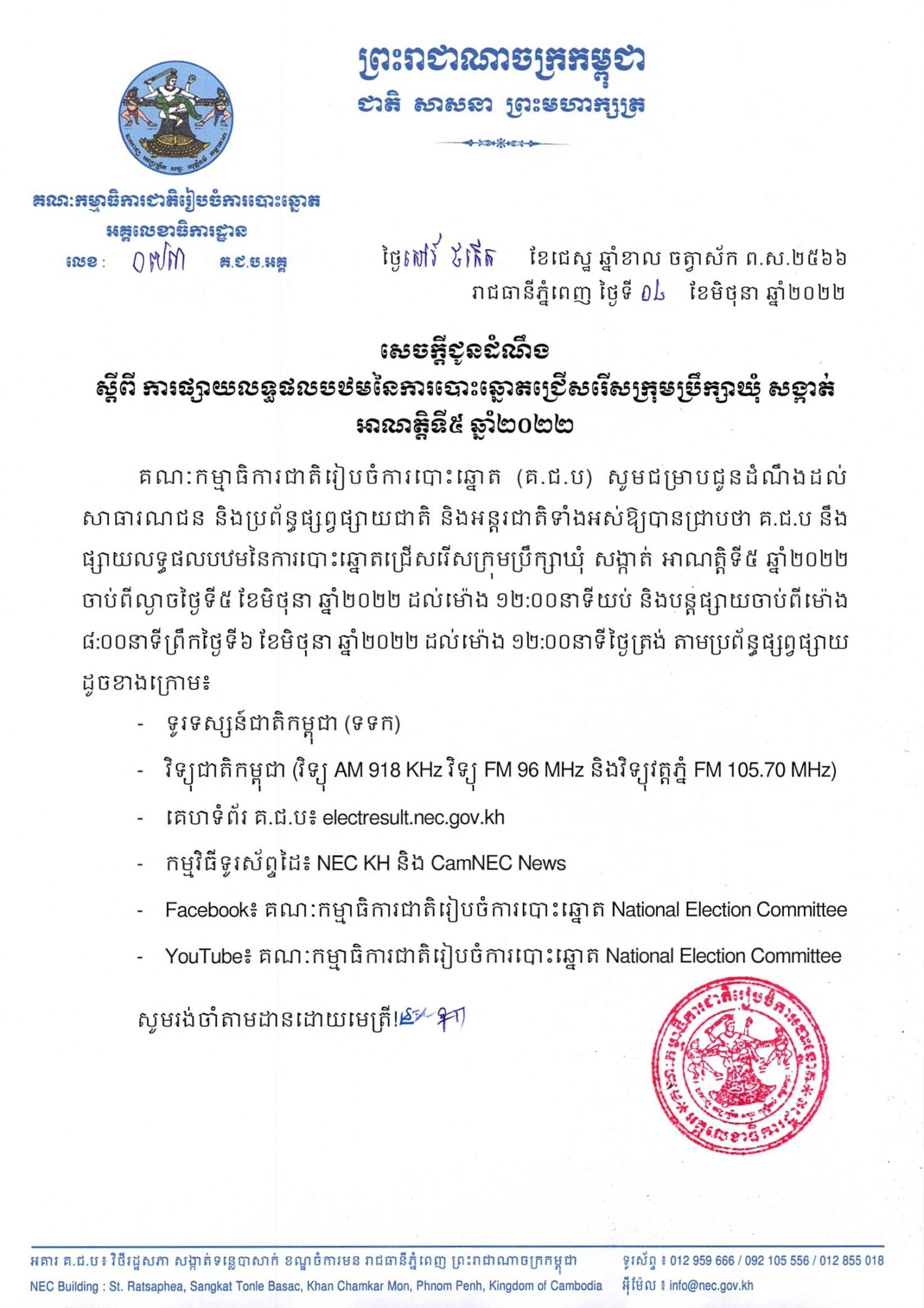 សាធារណជន និងប្រព័ន្ធផ្សព្វផ្សាយជាតិ និងអន្តរជាតិទាំងអស់ឱ្យបានជ្រាបថា គ.ជ.ប នឹងផ្សាយលទ្ធផលបឋមនៃការបោះឆ្នោតជ្រើសរើសក្រុមប្រឹក្សាឃុំ សង្កាត់ អាណត្តិទី៥ ឆ្នាំ២០២២ ចាប់ពីល្ងាចថ្ងៃទី៥ ខែមិថុនា ឆ្នាំ២០២២ ដល់ម៉ោង ១២:០០នាទីយប់ និងបន្តផ្សាយចាប់ពីម៉ោង ៨:០០នាទីព្រឹកថ្ងៃទី៦ ខែមិថុនា ឆ្នាំ២០២២ ដល់ម៉ោង ១២:០០នាទីថ្ងៃត្រង់ តាមប្រព័ន្ធផ្សព្វផ្សាយដូចខាងក្រោម៖
