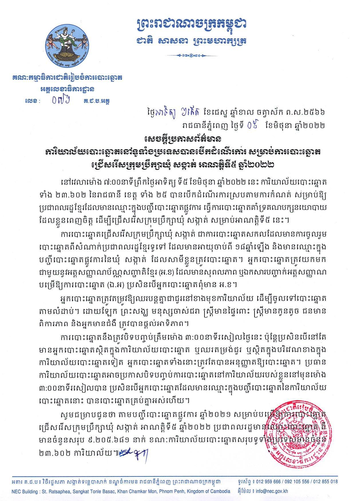 សេចក្តីប្រកាសព័ត៌មាន លេខ ០៧៦ គ.ជ.ប.អគ្គ៖ ការិយាល័យបោះឆ្នោតនៅទូទាំងប្រទេសបានបើកដំណើរការ សម្រាប់ការបោះឆ្នោតជ្រើសរើសក្រុមប្រឹក្សាឃុំ សង្កាត់ អាណត្តិទី៥ ឆ្នាំ២០២២