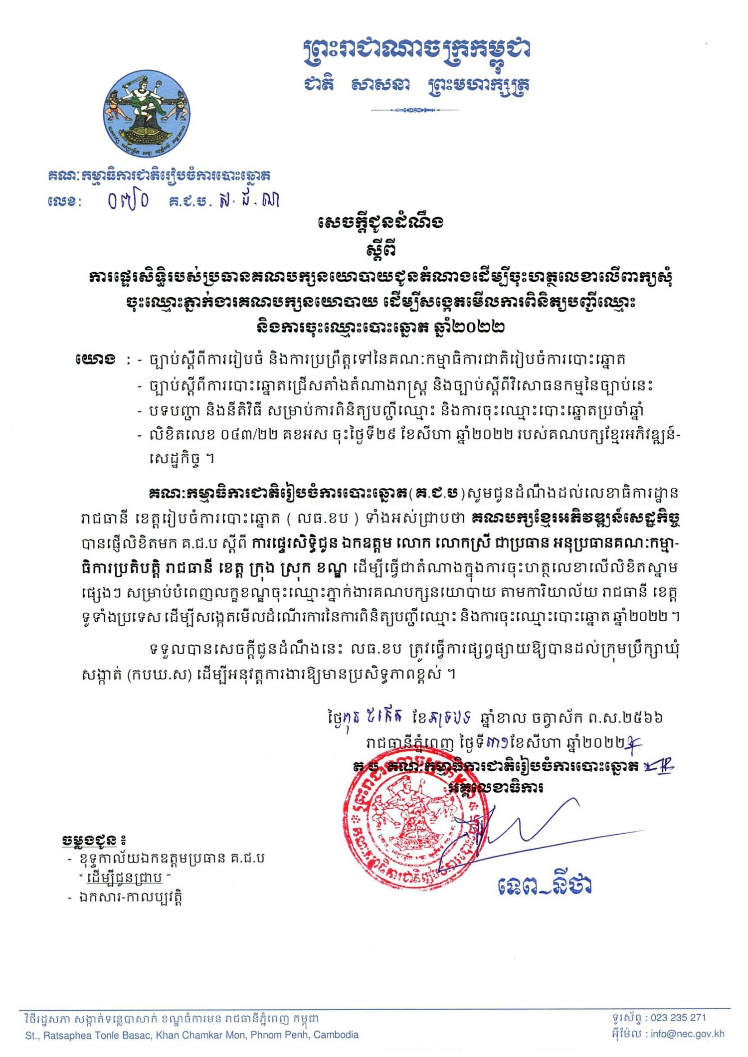 សេចក្ដីជូនដំណឹង លេខ ០៧០ គ.ជ.ប.ស.ជ.ណ ស្ដីពីការផ្ទេរសិទ្ធិរបស់ប្រធានគណបក្សខ្មែរអភិវឌ្ឍន៍សេដ្ឋកិច្ច ជូនតំណាងដើម្បីចុះហត្ថលេខាលើពាក្យសុំចុះឈ្មោះភ្នាក់ងារគណបក្សនយោបាយ ដើម្បីសង្កេតមើលការពិនិត្យបញ្ជីឈ្មោះ និងការចុះឈ្មោះបោះឆ្នោត ឆ្នាំ២០២២