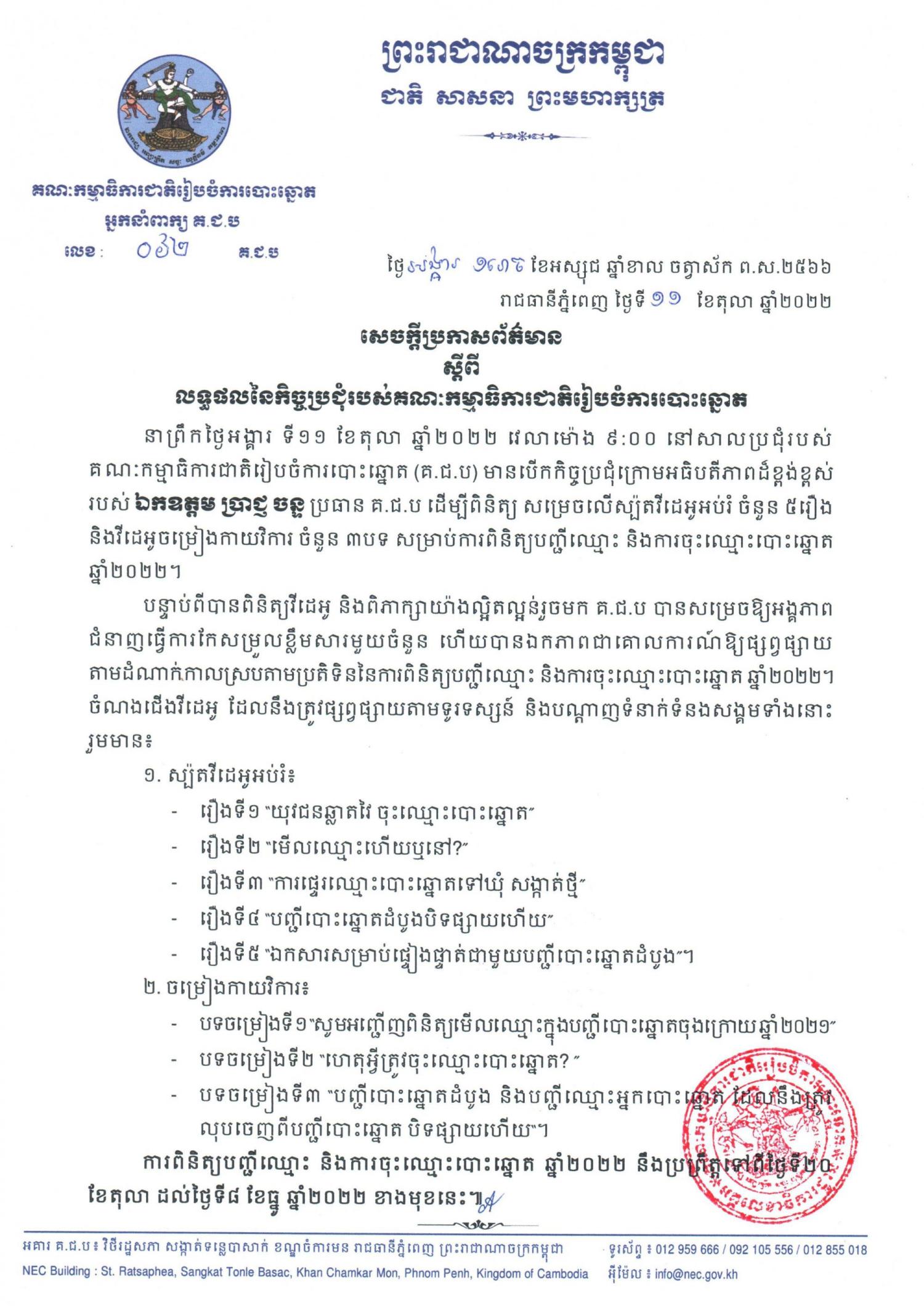 នាព្រឹកថ្ងៃអង្គារ ទី១១ ខែតុលា ឆ្នាំ២០២២ វេលាម៉ោង ៩:០០ នៅសាលប្រជុំរបស់គណៈកម្មាធិការជាតិរៀបចំការបោះឆ្នោត (គ.ជ.ប) មានបើកកិច្ចប្រជុំក្រោមអធិបតីភាពដ៏ខ្ពង់ខ្ពស់ របស់ ឯកឧត្តម ប្រាជ្ញ ចន្ទ ប្រធាន គ.ជ.ប ដើម្បីពិនិត្យ សម្រេចលើស្ប៉តវីដេអូអប់រំ ចំនួន ៥រឿង និងវីដេអូចម្រៀងកាយវិការ ចំនួន ៣បទ សម្រាប់ការពិនិត្យបញ្ជីឈ្មោះ និងការចុះឈ្មោះបោះឆ្នោត ឆ្នាំ២០២២។