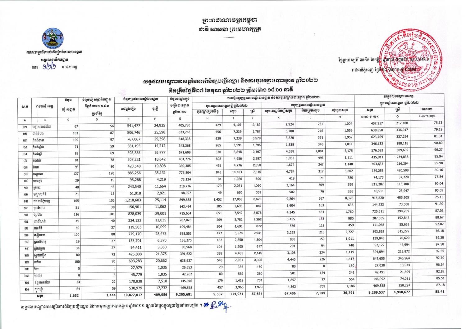 លទ្ធផលបណ្តោះអាសន្ននៃការពិនិត្យបញ្ជីឈ្មោះ និងការចុះឈ្មោះបោះឆ្នោត ឆ្នាំ២០២២ គិតចាប់ត្រឹមថ្ងៃទី២៧ ខែតុលា ឆ្នាំ២០២២