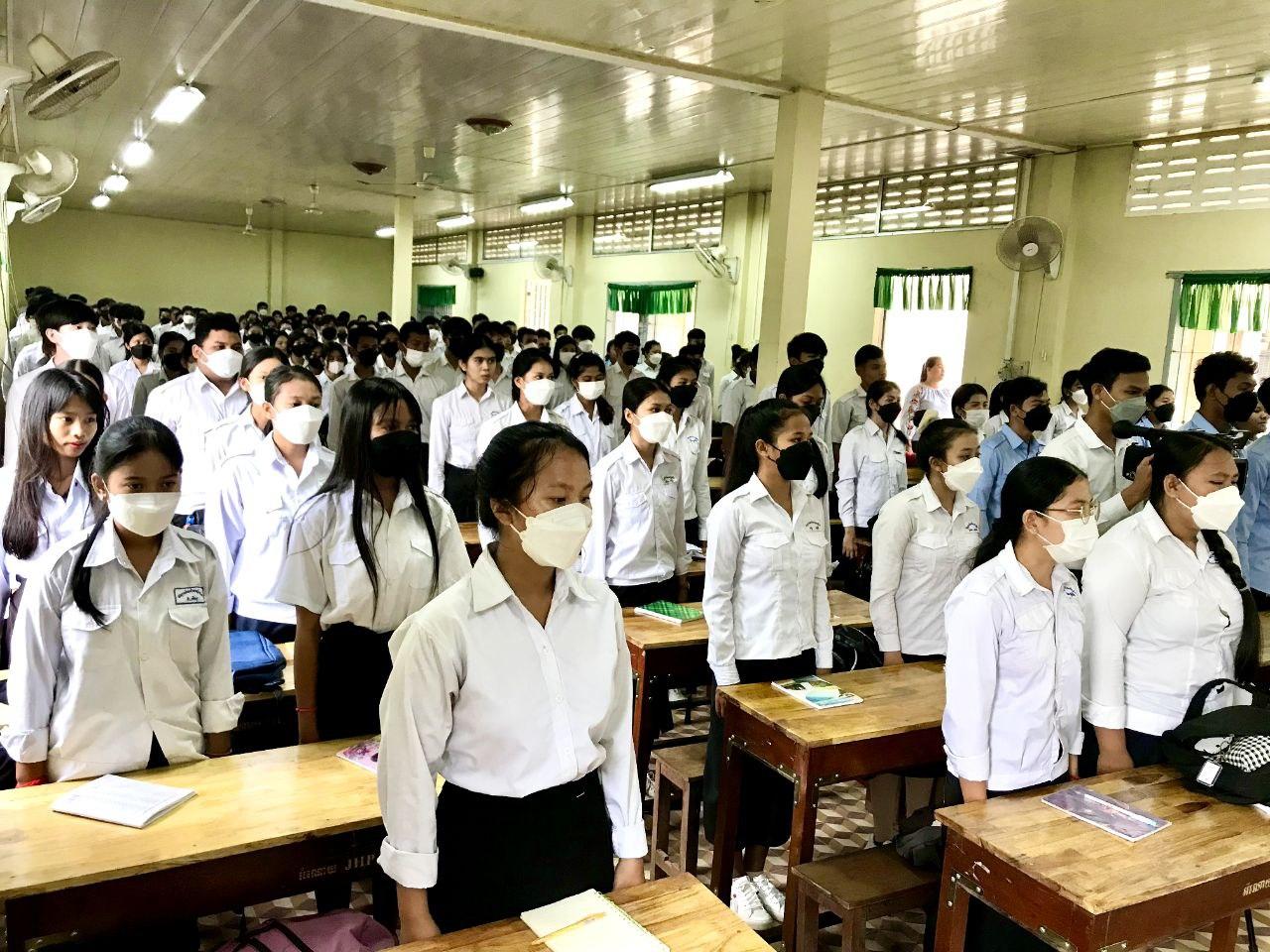 រូបភាពសកម្មភាពវគ្គអប់រំ ផ្សព្វផ្សាយ និងបញ្ជ្រាបការយល់ដឹងស្ដីពីសារៈសំខាន់នៃការបោះឆ្នោតនៅកម្ពុជា ជូនដល់ សិស្សានុសិស្ស នៅវិទ្យាល័យជ័យវរ្ម័ន ទី៧ ស្រុកកៀនស្វាយ ខេត្តកណ្ដាល ក្រោមអធិបតីភាព ឯកឧត្ដម ម៉ុក ដារ៉ា អគ្គលេខាធិការរង គ.ជ.ប នាព្រឹកថ្ងៃទី៤ ខែវិច្ឆិកា ឆ្នាំ២០២២។