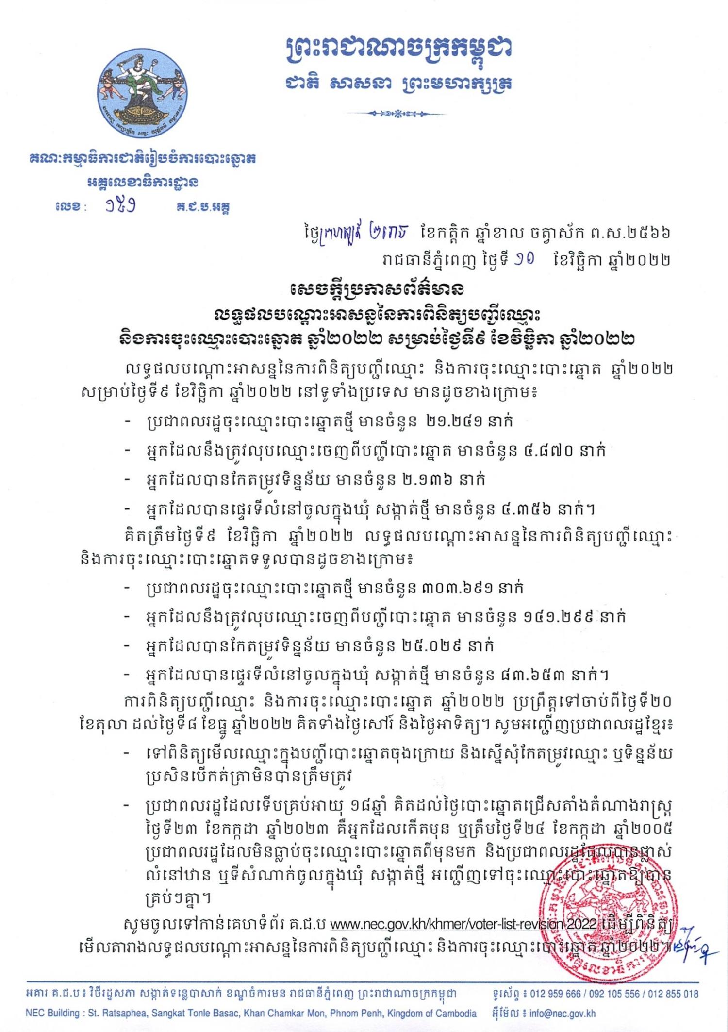 លទ្ធផលបណ្ដោះអាសន្ននៃការពិនិត្យបញ្ជីឈ្មោះ និងការចុះឈ្មោះបោះឆ្នោត ឆ្នាំ២០២២ សម្រាប់ថ្ងៃទី៩ ខែវិច្ឆិកា ឆ្នាំ២០២២ នៅទូទាំងប្រទេស មានដូចខាងក្រោម៖