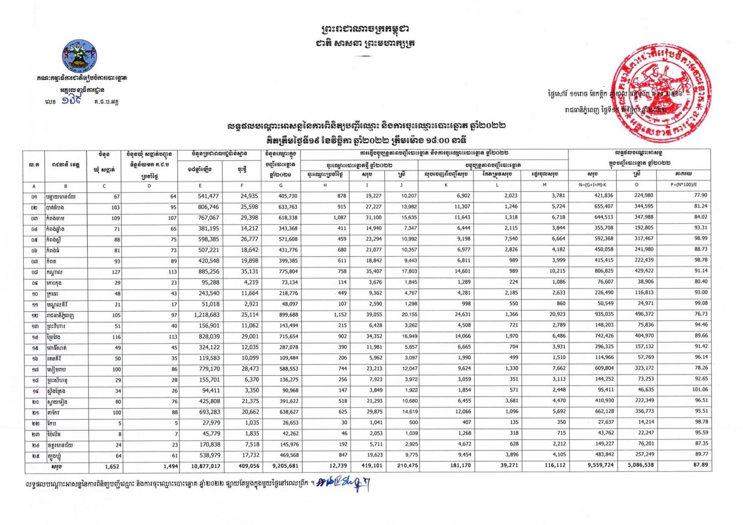 លទ្ធផលបណ្តោះអាសន្ននៃការពិនិត្យបញ្ជីឈ្មោះ និងការចុះឈ្មោះបោះឆ្នោត ឆ្នាំ២០២២ គិតត្រឹមថ្ងៃទី១៩ ខែវិច្ឆិកា ឆ្នាំ២០២២