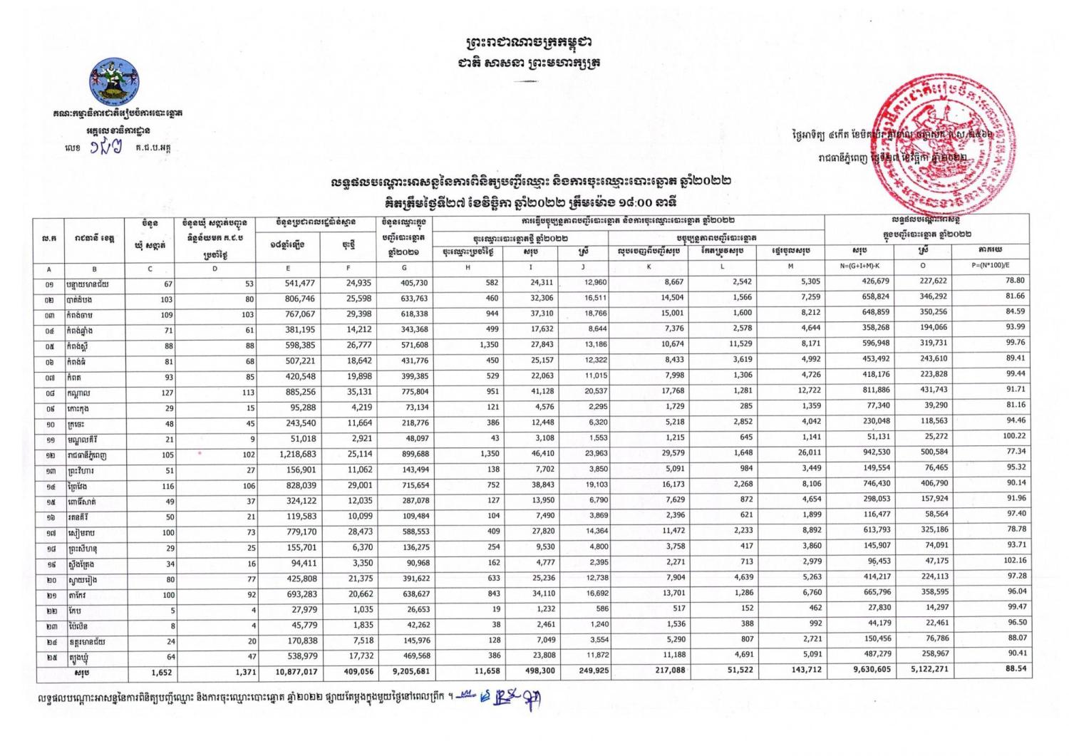 លទ្ធផលបណ្តោះអាសន្ននៃការពិនិត្យបញ្ជីឈ្មោះ និងការចុះឈ្មោះបោះឆ្នោត ឆ្នាំ២០២២ គិតត្រឹមថ្ងៃទី២៧ ខែវិច្ឆិកា ឆ្នាំ២០២២