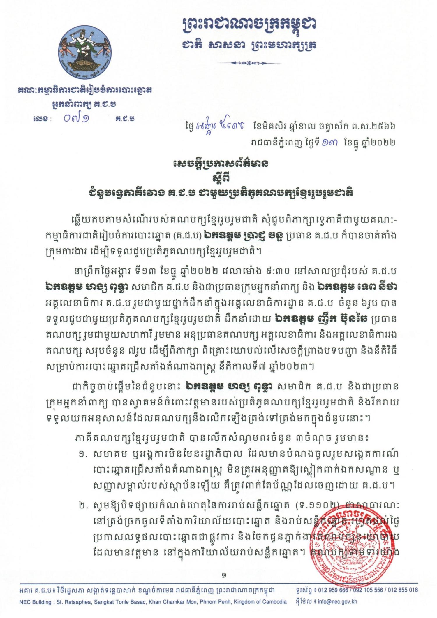 នាព្រឹកថ្ងៃអង្គារ ទី១៣ ខែធ្នូ ឆ្នាំ២០២២ វេលាម៉ោង ៩:៣០ នៅសាលប្រជុំរបស់ គ.ជ.ប ឯកឧត្តម ហង្ស ពុទ្ធា សមាជិក គ.ជ.ប និងជាប្រធានក្រុមអ្នកនាំពាក្យ និង ឯកឧត្តម ទេព នីថា អគ្គលេខាធិការ គ.ជ.ប រួមជាមួយថ្នាក់ដឹកនាំក្នុងអគ្គលេខាធិការដ្ឋាន គ.ជ.ប ចំនួន ៦រូប បានទទួលជួបជាមួយប្រតិភូគណបក្សខ្មែររួបរួមជាតិ ដឹកនាំដោយ ឯកឧត្តម ញឹក ប៊ុនឆៃ ប្រធានគណបក្ស រួមជាមួយសហការី រួមមាន អនុប្រធានគណបក្ស អគ្គលេខាធិការ និងអគ្គលេខាធិការរងគណបក្ស សរុបចំនួន ៧រូប ដើម្បីពិភាក្សា ពិគ្រោះយោបល់លើសេចក្តីព្រាងបទបញ្ជា និងនីតិវិធី សម្រាប់ការបោះឆ្នោតជ្រើសតាំងតំណាងរាស្ត្រ នីតិកាលទី៧ ឆ្នាំ២០២៣។