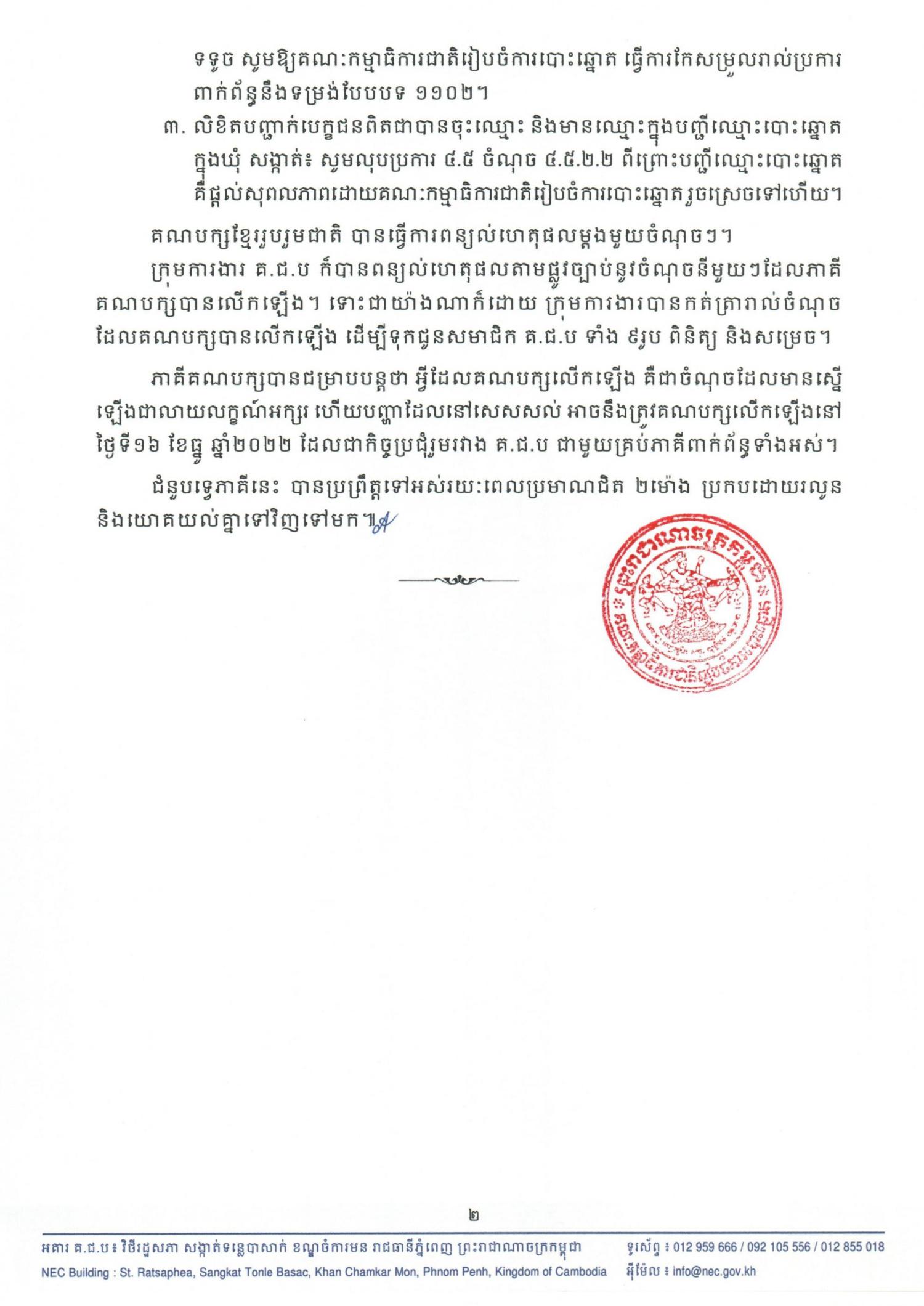 ភាគីគណបក្សបានជម្រាបបន្តថា អ្វីដែលគណបក្សលើកឡើង គឺជាចំណុចដែលមានស្នើឡើងជាលាយលក្ខណ៍អក្សរ ហើយបញ្ហាដែលនៅសេសសល់ អាចនឹងត្រូវគណបក្សលើកឡើងនៅថ្ងៃទី១៦ ខែធ្នូ ឆ្នាំ២០២២ ដែលជាកិច្ចប្រជុំរួមរវាង គ.ជ.ប ជាមួយគ្រប់ភាគីពាក់ព័ន្ធទាំងអស់។
