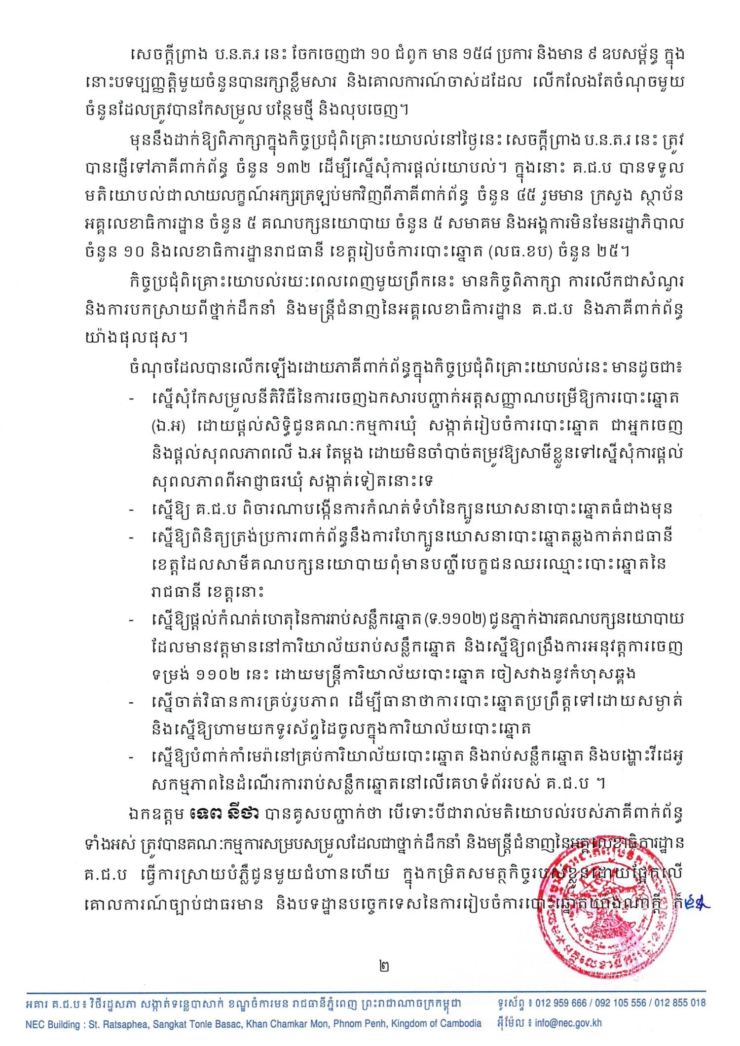 ឯកឧត្ដម ទេព នីថា បានគូសបញ្ជាក់ថា បើទោះបីជារាល់មតិយោបល់របស់ភាគីពាក់ព័ន្ធទាំងអស់ ត្រូវបានគណៈកម្មការសម្របសម្រួលដែលជាថ្នាក់ដឹកនាំ និងមន្រ្តីជំនាញនៃអគ្គលេខាធិការដ្ឋាន គ.ជ.ប ធ្វើការស្រាយបំភ្លឺជូនមួយជំហានហើយ ក្នុងកម្រិតសមត្ថកិច្ចរបស់ខ្លួនដោយផ្អែកលើគោលការណ៍ច្បាប់ជាធរមាន និងបទដ្ឋានបច្ចេកទេសនៃការរៀបចំការបោះឆ្នោតយ៉ាងណាក្ដី ក៏អគ្គលេខាធិការដ្ឋាន គ.ជ.ប នឹងធ្វើការបូកសរុបរាល់មតិយោបល់ ទាំងយោបល់ជាលាយលក្ខណ៍អក្សរ និងយោបល់ដែលបានលើកឡើងបន្ថែមក្នុងកិច្ចប្រជុំព្រឹកនេះ ដើម្បីដាក់ជូនថ្នាក់ដឹកនាំ គ.ជ.ប ពិនិត្យ ពិភាក្សា និងសម្រេចចុងក្រោយក្នុងពេលដ៏ឆាប់ខាងមុខ។