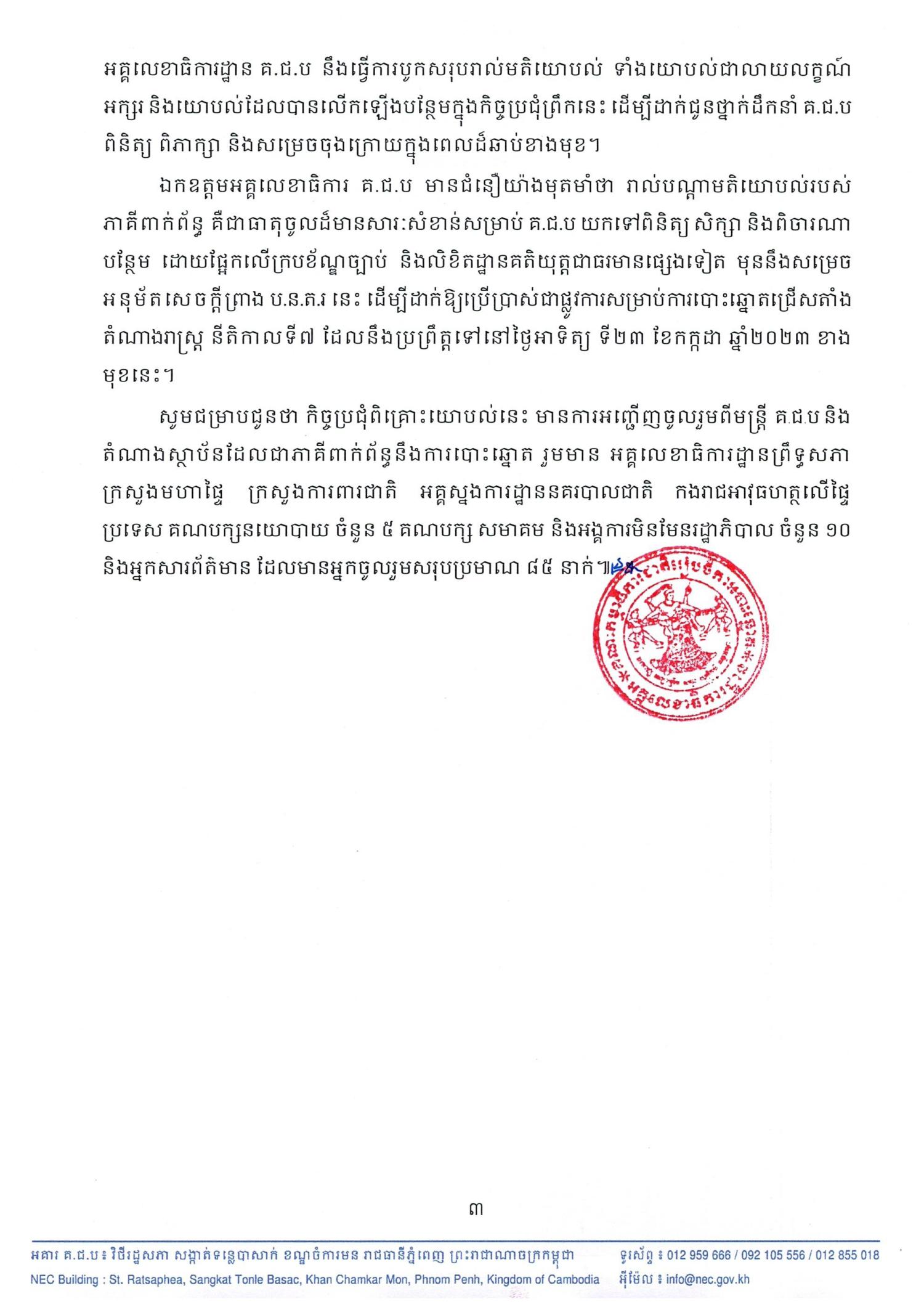 ឯកឧត្ដមអគ្គលេខាធិការ គ.ជ.ប មានជំនឿយ៉ាងមុតមាំថា រាល់បណ្តាមតិយោបល់របស់ភាគីពាក់ព័ន្ធ គឺជាធាតុចូលដ៏មានសារៈសំខាន់សម្រាប់ គ.ជ.ប យកទៅពិនិត្យ សិក្សា និងពិចារណាបន្ថែម ដោយផ្អែកលើក្របខ័ណ្ឌច្បាប់ និងលិខិតដ្ឋានគតិយុត្តជាធរមានផ្សេងទៀត មុននឹងសម្រេចអនុម័តសេចក្ដីព្រាង ប.ន.ត.រ នេះ ដើម្បីដាក់ឱ្យប្រើប្រាស់ជាផ្លូវការសម្រាប់ការបោះឆ្នោតជ្រើសតាំងតំណាងរាស្រ្ត នីតិកាលទី៧ ដែលនឹងប្រព្រឹត្តទៅនៅថ្ងៃអាទិត្យ ទី២៣ ខែកក្កដា ឆ្នាំ២០២៣ ខាងមុខនេះ។