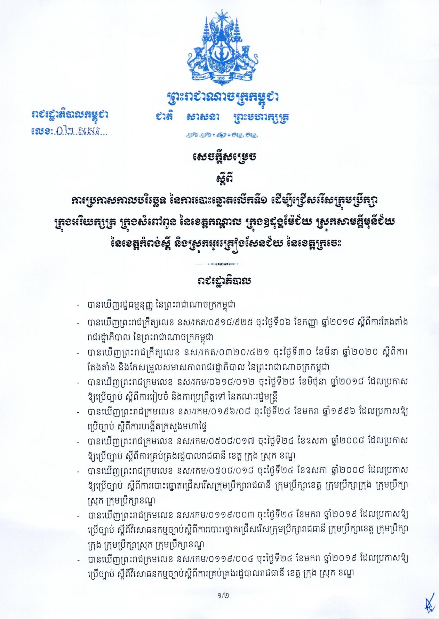 សេចក្ដីសម្រេចរបស់រាជរដ្ឋាភិបាលកម្ពុជាលេខ ០២ សសរ ស្ដីពីការប្រកាសកាលបរិច្ឆេទ នៃការបោះឆ្នោតលើកទី១ ដើម្បីជ្រើសរើសក្រុមប្រឹក្សាក្រុងអរិយក្សត្រ ក្រុងសំពៅពូន នៃខេត្តកណ្ដាល ក្រុងឧដុង្គម៉ែជ័យ ស្រុកសាមគ្គីមុនីជ័យ នៃខេត្តកំពង់ស្ពឺ និងស្រុកអូគ្រៀងសែនជ័យ នៃខេត្តក្រចេះ