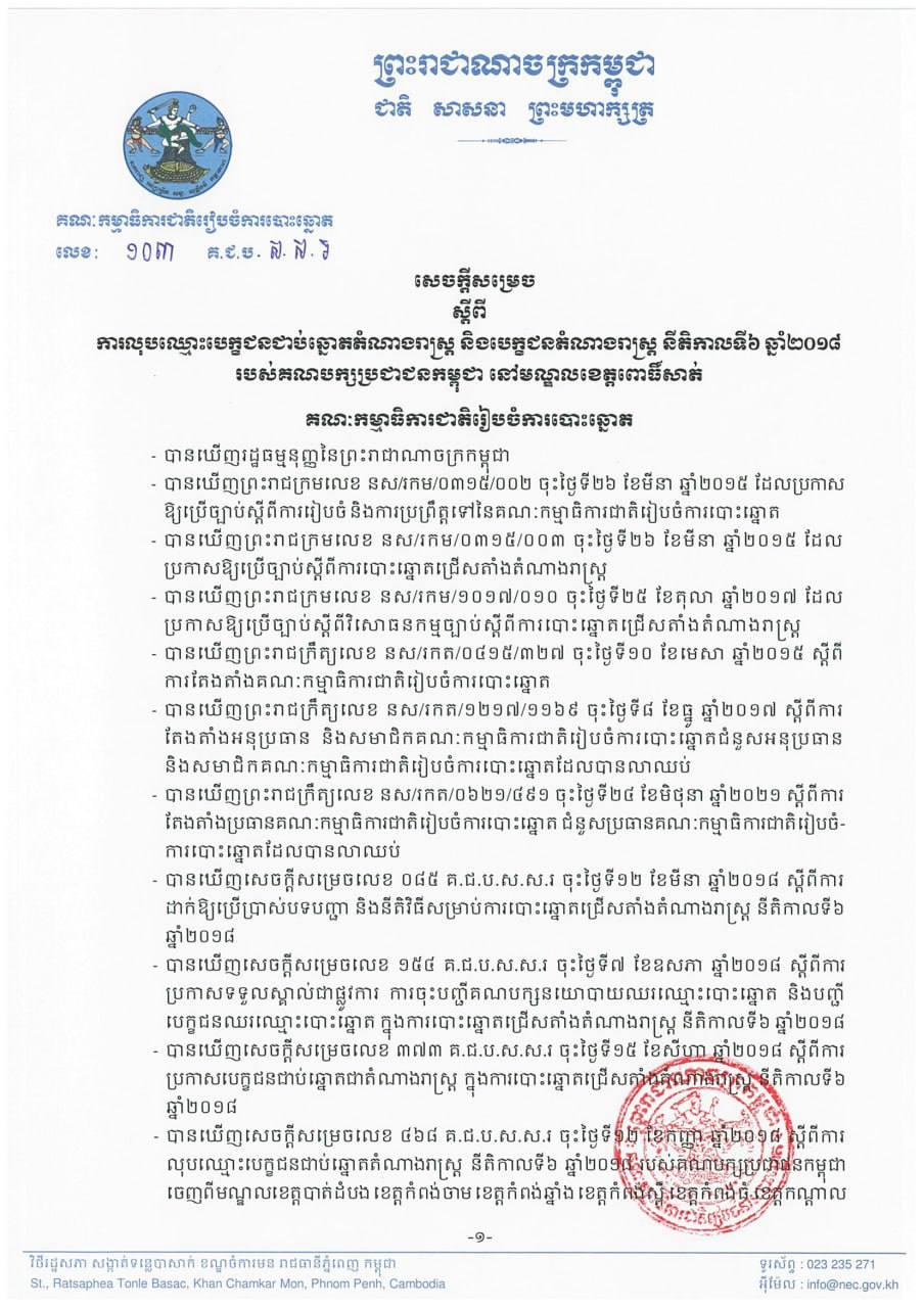 សេចក្ដីសម្រេចលេខ ១០៣ គ.ជ.ប.ស.ស.រ ស្ដីពីការលុបឈ្មោះបេក្ខជនជាប់ឆ្នោតតំណាងរាស្ត្រ និងបេក្ខជនតំណាងរាស្ត្រ នីតិកាលទី៦ ឆ្នាំ២០១៨ របស់គណបក្សប្រជាជនកម្ពុជា នៅមណ្ឌលខេត្តពោធិ៍សាត់
