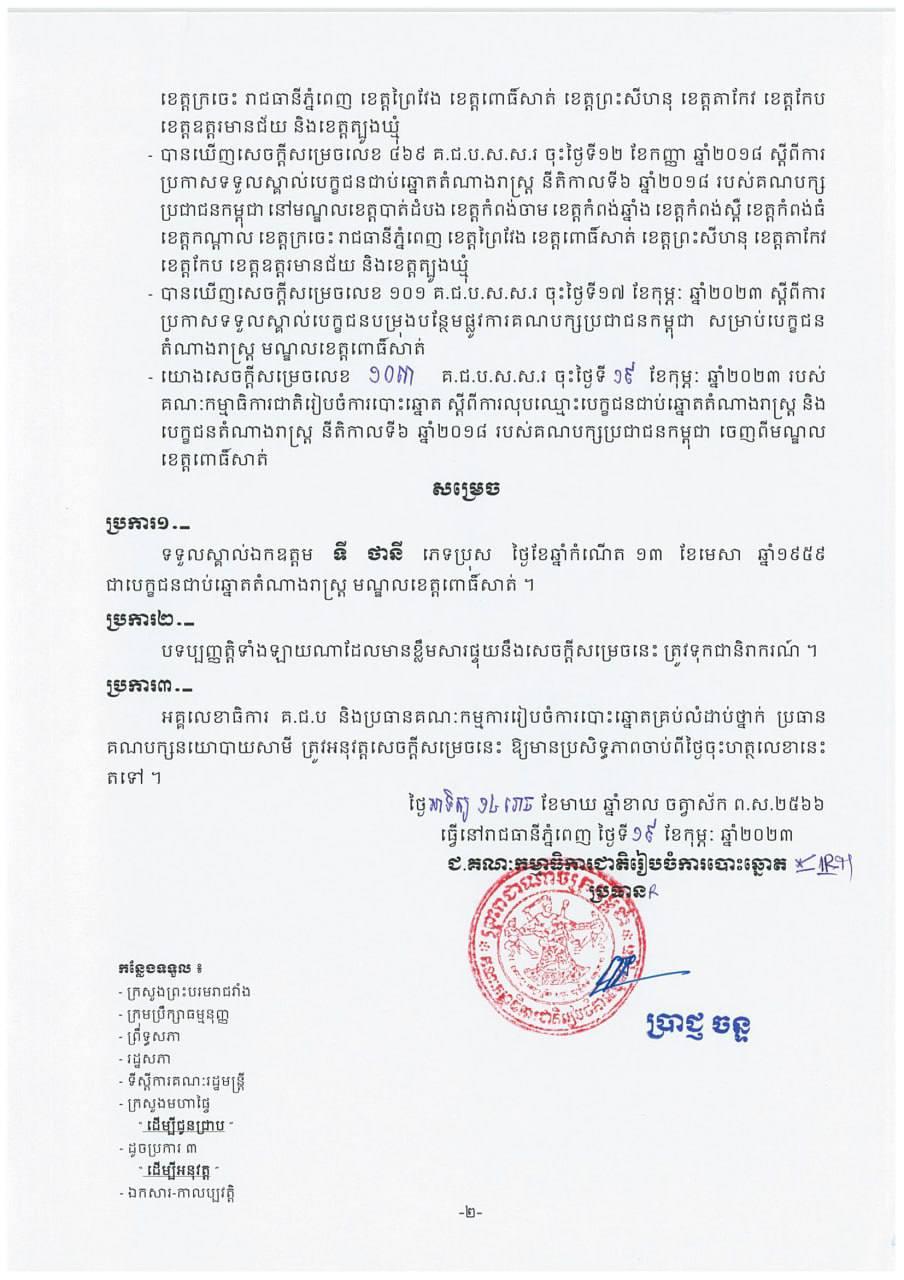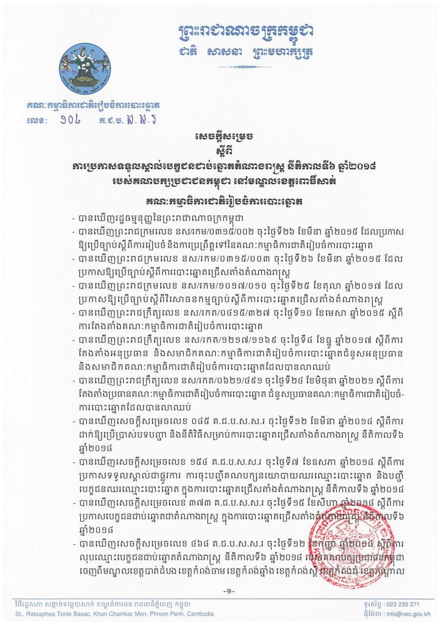សេចក្ដីសម្រេចលេខ ១០៤ គ.ជ.ប.ស.ស.រ ស្ដីពីការប្រកាសទទួលស្គាល់បេក្ខជនជាប់ឆ្នោតតំណាងរាស្ត្រ នីតិកាលទី៦ ឆ្នាំ២០១៨ របស់គណបក្សប្រជាជនកម្ពុជា នៅមណ្ឌលខេត្តពោធិ៍សាត់