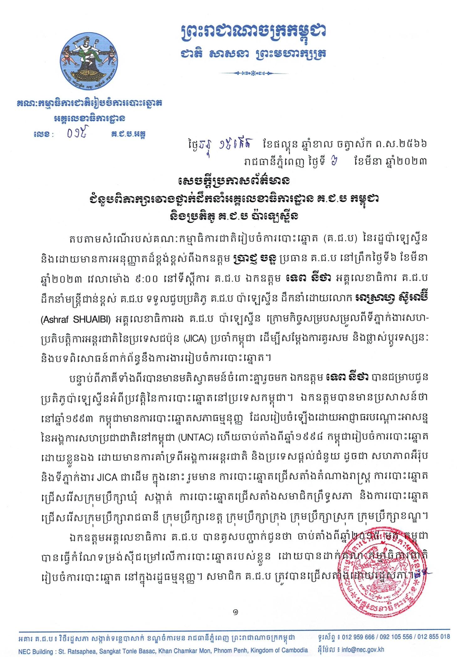 តបតាមសំណើរបស់គណៈកម្មាធិការជាតិរៀបចំការបោះឆ្នោត (គ.ជ.ប) នៃរដ្ឋប៉ាឡេស្ទីន និងដោយមានការអនុញ្ញាតដ៏ខ្ពង់ខ្ពស់ពីឯកឧត្ដម ប្រាជ្ញ ចន្ទ ប្រធាន គ.ជ.ប នៅព្រឹកថ្ងៃទី៦ ខែមីនា ឆ្នាំ២០២៣ វេលាម៉ោង ៩:០០ នៅទីស្ដីការ គ.ជ.ប ឯកឧត្ដម ទេព នីថា អគ្គលេខាធិការ គ.ជ.ប ដឹកនាំមន្រ្តីជាន់ខ្ពស់ គ.ជ.ប ទទួលជួបប្រតិភូ គ.ជ.ប ប៉ាឡេស្ទីន ដឹកនាំដោយលោក អាស្រាហ្វ ស៊ូអាប៊ី (Ashraf SHUAIBI) អគ្គលេខាធិការរង គ.ជ.ប ប៉ាឡេស្ទីន ក្រោមកិច្ចសម្របសម្រួលពីទីភ្នាក់ងារសហ-ប្រតិបត្តិការអន្តរជាតិនៃប្រទេសជប៉ុន (JICA) ប្រចាំកម្ពុជា ដើម្បីសម្ដែងការគួរសម និងផ្លាស់ប្ដូរទស្សនៈ និងបទពិសោធន៍ពាក់ព័ន្ធនឹងការងាររៀបចំការបោះឆ្នោត។