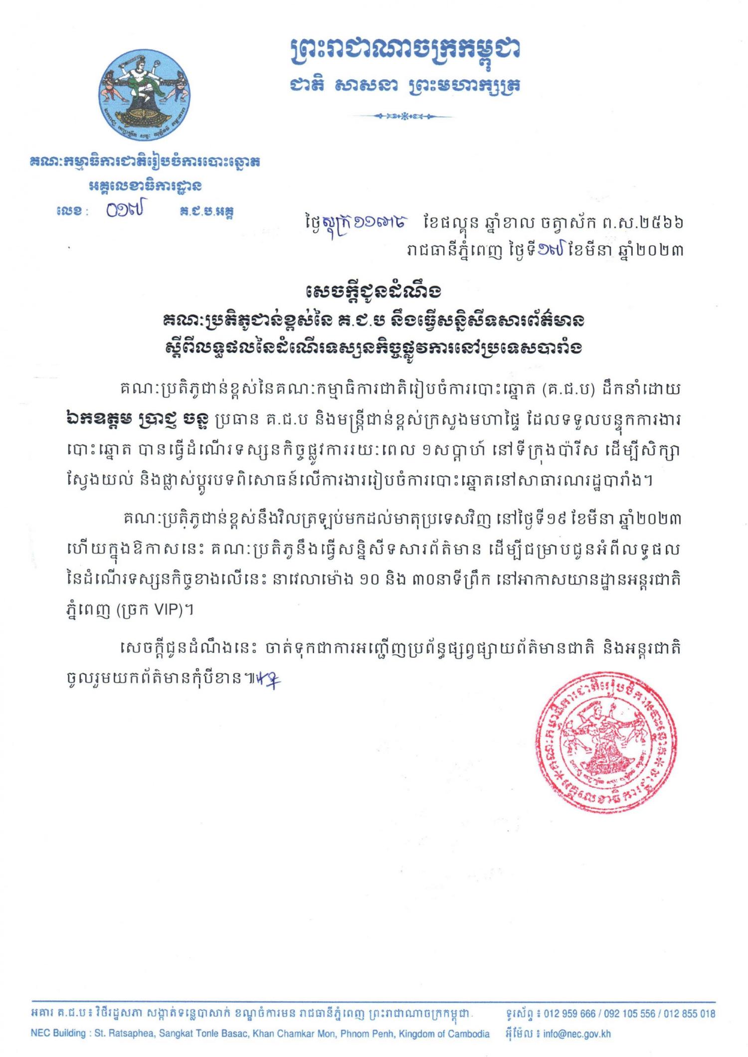 គណៈប្រតិភូជាន់ខ្ពស់នៃគណៈកម្មាធិការជាតិរៀបចំការបោះឆ្នោត (គ.ជ.ប) ដឹកនាំដោយឯកឧត្ដម ប្រាជ្ញ ចន្ទ ប្រធាន គ.ជ.ប និងមន្រ្តីជាន់ខ្ពស់ក្រសួងមហាផ្ទៃ ដែលទទួលបន្ទុកការងារបោះឆ្នោត បានធ្វើដំណើរទស្សនកិច្ចផ្លូវការរយៈពេល ១សប្ដាហ៍ នៅទីក្រុងប៉ារីស ដើម្បីសិក្សាស្វែងយល់ និងផ្លាស់ប្តូរបទពិសោធន៍លើការងាររៀបចំការបោះឆ្នោតនៅសាធារណរដ្ឋបារាំង។