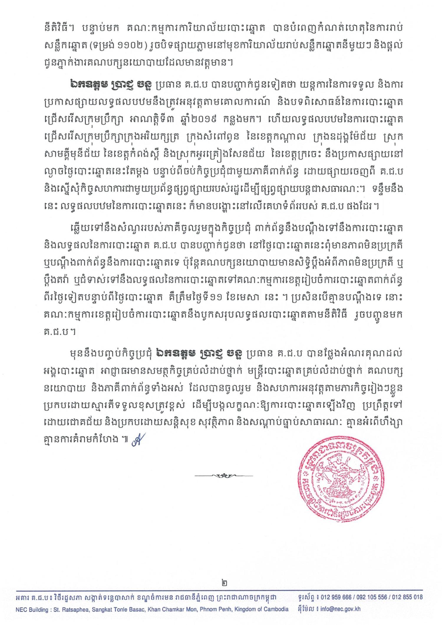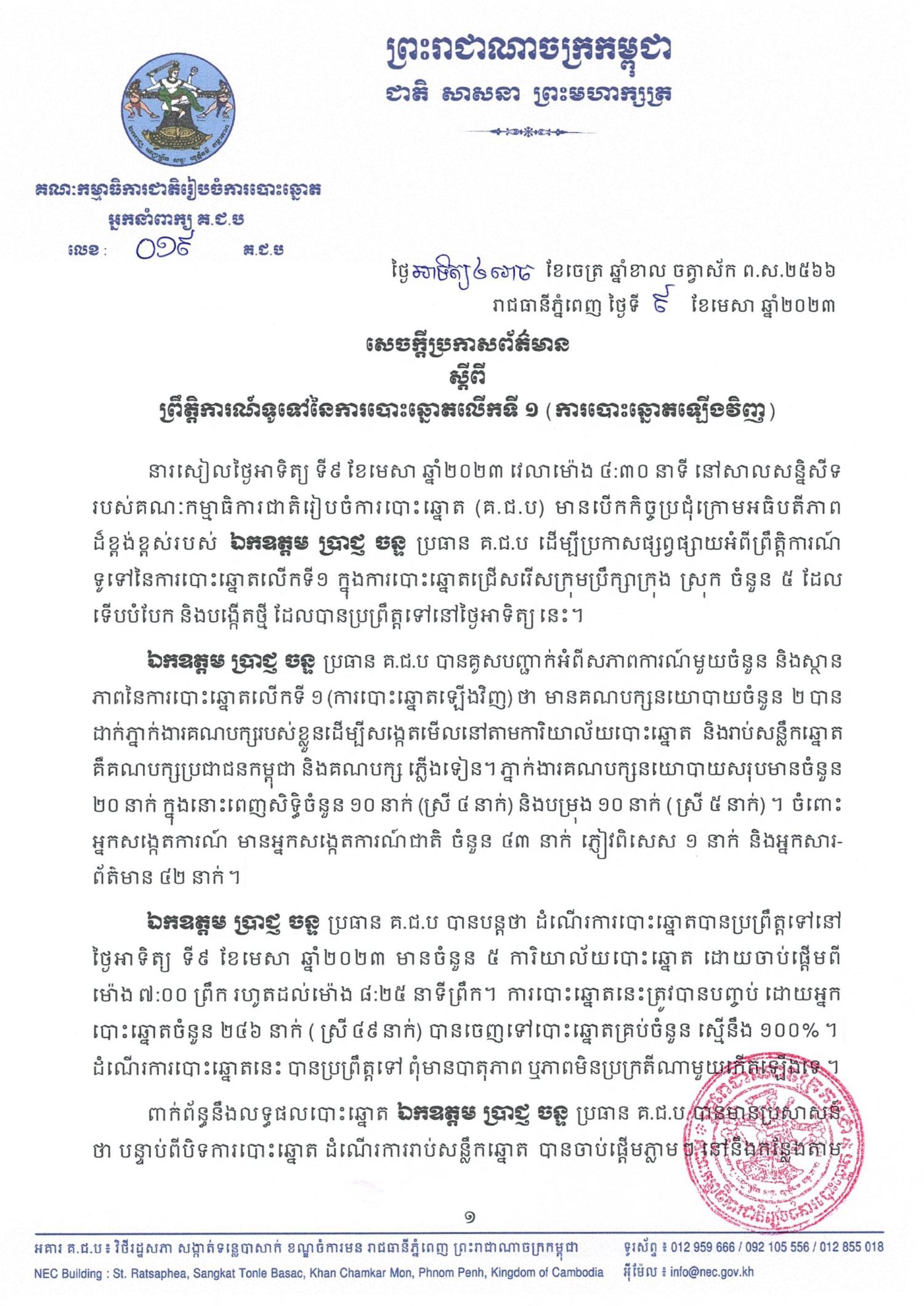 នារសៀលថ្ងៃអាទិត្យ ទី៩ ខែមេសា ឆ្នាំ២០២៣ វេលាម៉ោង ៤:៣០ នាទី នៅសាលសន្និសីទរបស់គណៈកម្មាធិការជាតិរៀបចំការបោះឆ្នោត (គ.ជ.ប) មានបើកកិច្ចប្រជុំក្រោមអធិបតីភាពដ៏ខ្ពង់ខ្ពស់របស់ ឯកឧត្តម ប្រាជ្ញ ចន្ទ ប្រធាន គ.ជ.ប ដើម្បីប្រកាសផ្សព្វផ្សាយអំពីព្រឹត្តិការណ៍ទូទៅនៃការបោះឆ្នោតលើកទី១ ក្នុងការបោះឆ្នោតជ្រើសរើសក្រុមប្រឹក្សាក្រុង ស្រុក ចំនួន ៥ ដែលទើបបំបែក និងបង្កើតថ្មី ដែលបានប្រព្រឹត្តទៅនៅថ្ងៃអាទិត្យនេះ ។