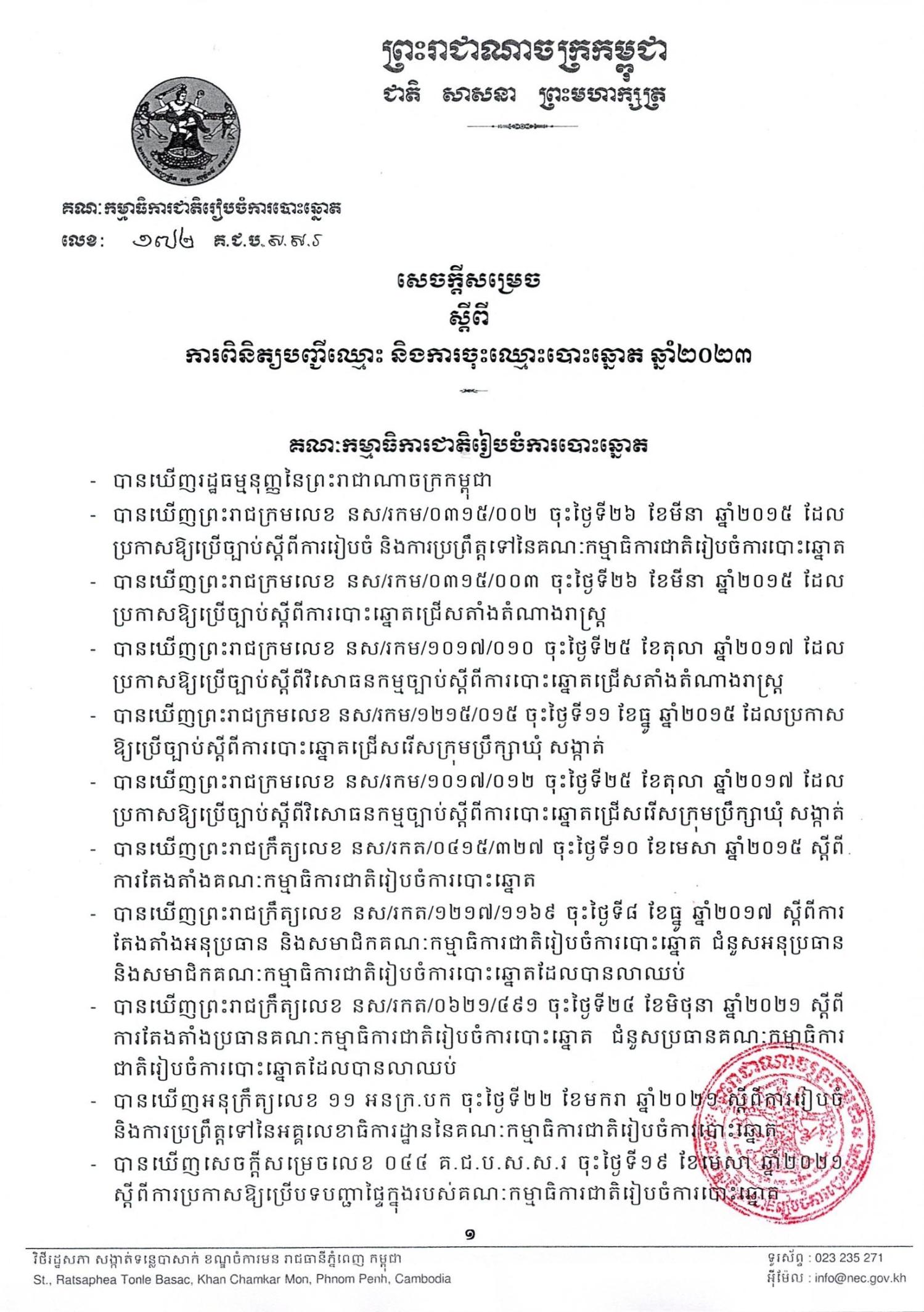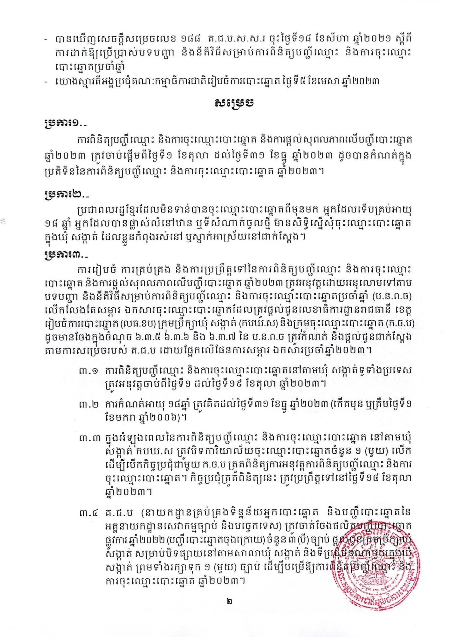 សេចក្តីសម្រេចលេខ ១៧២ គ.ជ.ប.ស.ស.រ ស្តីពី ការពិនិត្យបញ្ចីឈ្មោះ និងការចុះឈ្មោះបោះឆ្នោត ឆ្នាំ២០២៣