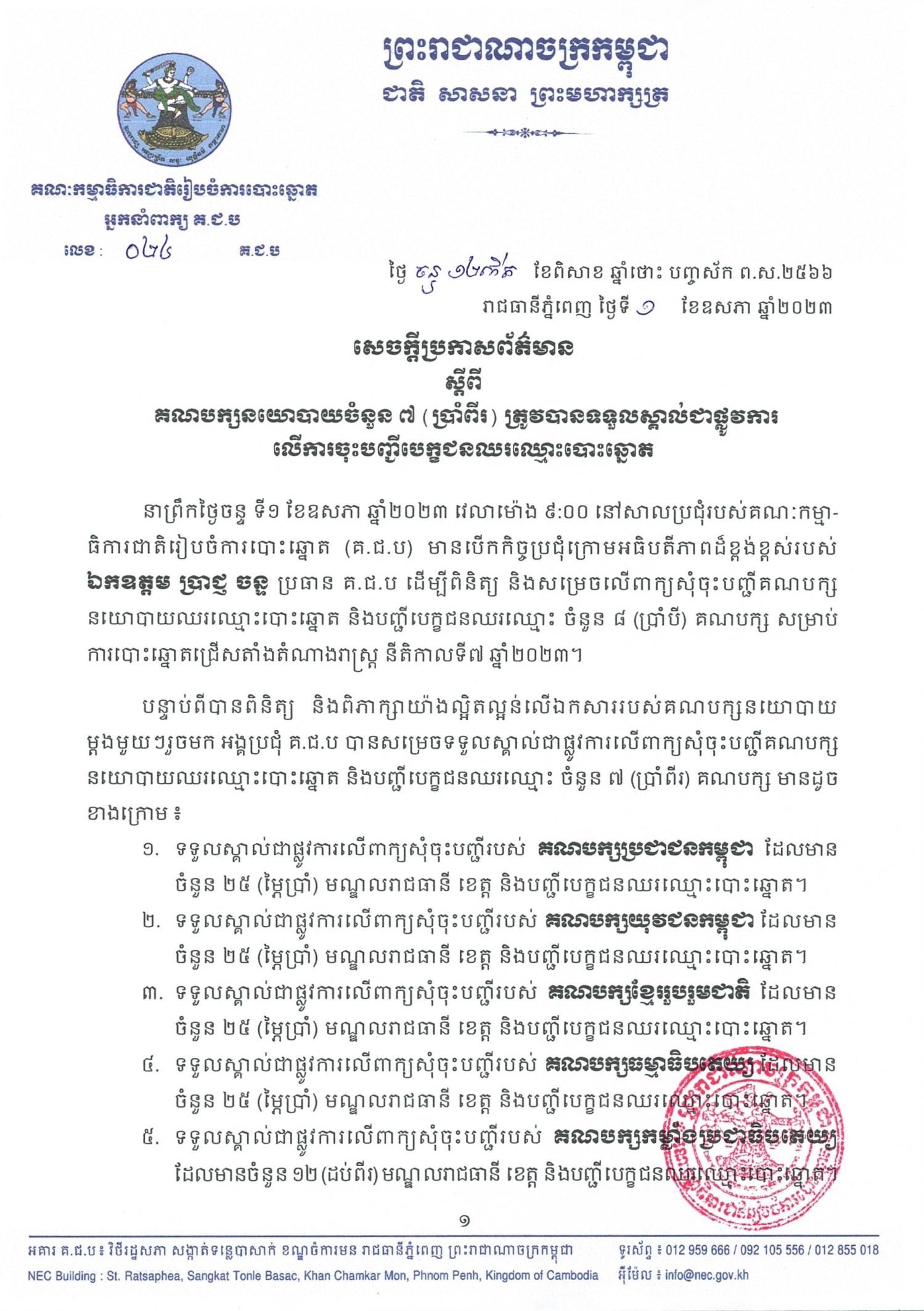 នាព្រឹកថ្ងៃចន្ទ ទី១ ខែឧសភា ឆ្នាំ២០២៣ វេលាម៉ោង ៩:០០ នៅសាលប្រជុំរបស់គណៈកម្មា-ធិការជាតិរៀបចំការបោះឆ្នោត (គ.ជ.ប) មានបើកកិច្ចប្រជុំក្រោមអធិបតីភាពដ៏ខ្ពង់ខ្ពស់របស់ ឯកឧត្តម ប្រាជ្ញ ចន្ទ ប្រធាន គ.ជ.ប ដើម្បីពិនិត្យ និងសម្រេចលើពាក្យសុំចុះបញ្ជីគណបក្សនយោបាយឈរឈ្មោះបោះឆ្នោត និងបញ្ជីបេក្ខជនឈរឈ្មោះ ចំនួន ៨ (ប្រាំបី) គណបក្ស សម្រាប់ការបោះឆ្នោតជ្រើសតាំងតំណាងរាស្ត្រ នីតិកាលទី៧ ឆ្នាំ២០២៣។