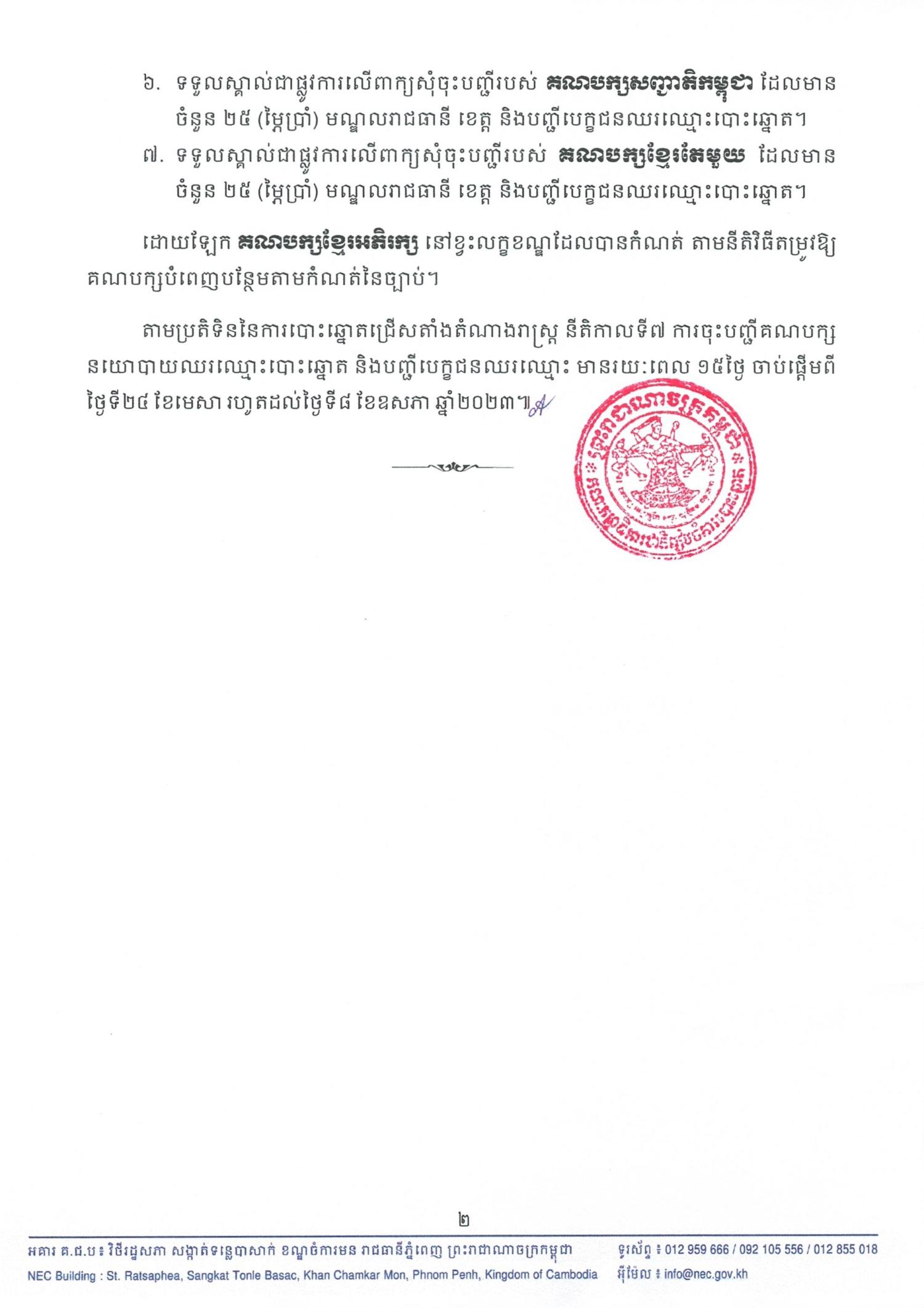 ២.ទទួលស្គាល់ជាផ្លូវការលើពាក្យសុំចុះបញ្ជីរបស់ គណបក្សយុវជនកម្ពុជា ដែលមានចំនួន ២៥ (ម្ភៃប្រាំ) មណ្ឌលរាជធានី ខេត្ត និងបញ្ជីបេក្ខជនឈរឈ្មោះបោះឆ្នោត។