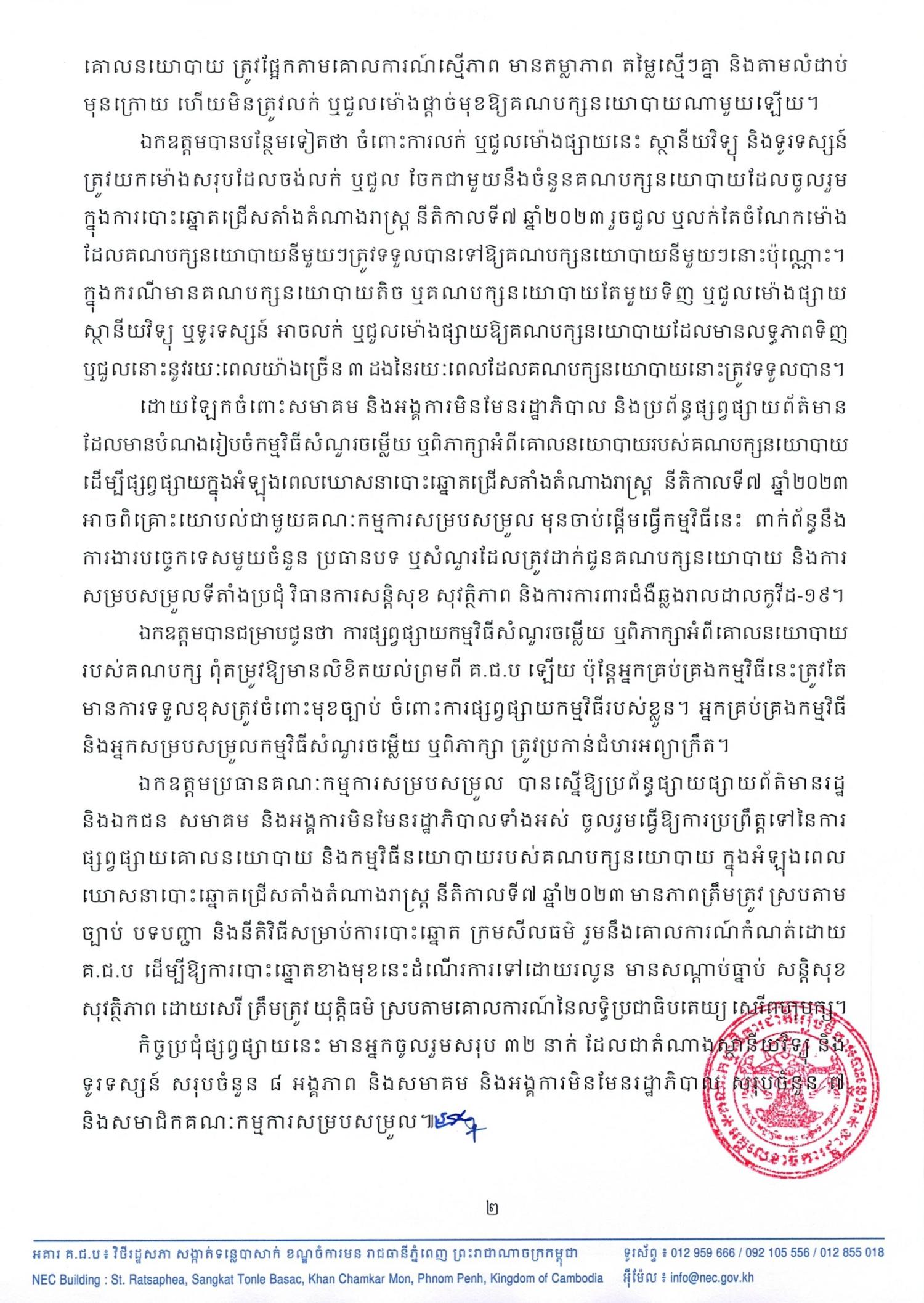 - គោលការណ៍សម្រាប់ស្ថានីយវិទ្យុ និងទូរទស្សន៍ ក្នុងការលក់ ឬជួលម៉ោងផ្សព្វផ្សាយឱ្យគណបក្សនយោបាយ ដើម្បីធ្វើការផ្សព្វផ្សាយអំពីគោលនយោបាយ និងកម្មវិធីនយោបាយរបស់ខ្លួនក្នុងអំឡុងពេលឃោសនាបោះឆ្នោត សម្រាប់ការបោះឆ្នោតជ្រើសតាំងតំណាងរាស្រ្ត នីតិកាលទី៧ ឆ្នាំ២០២៣