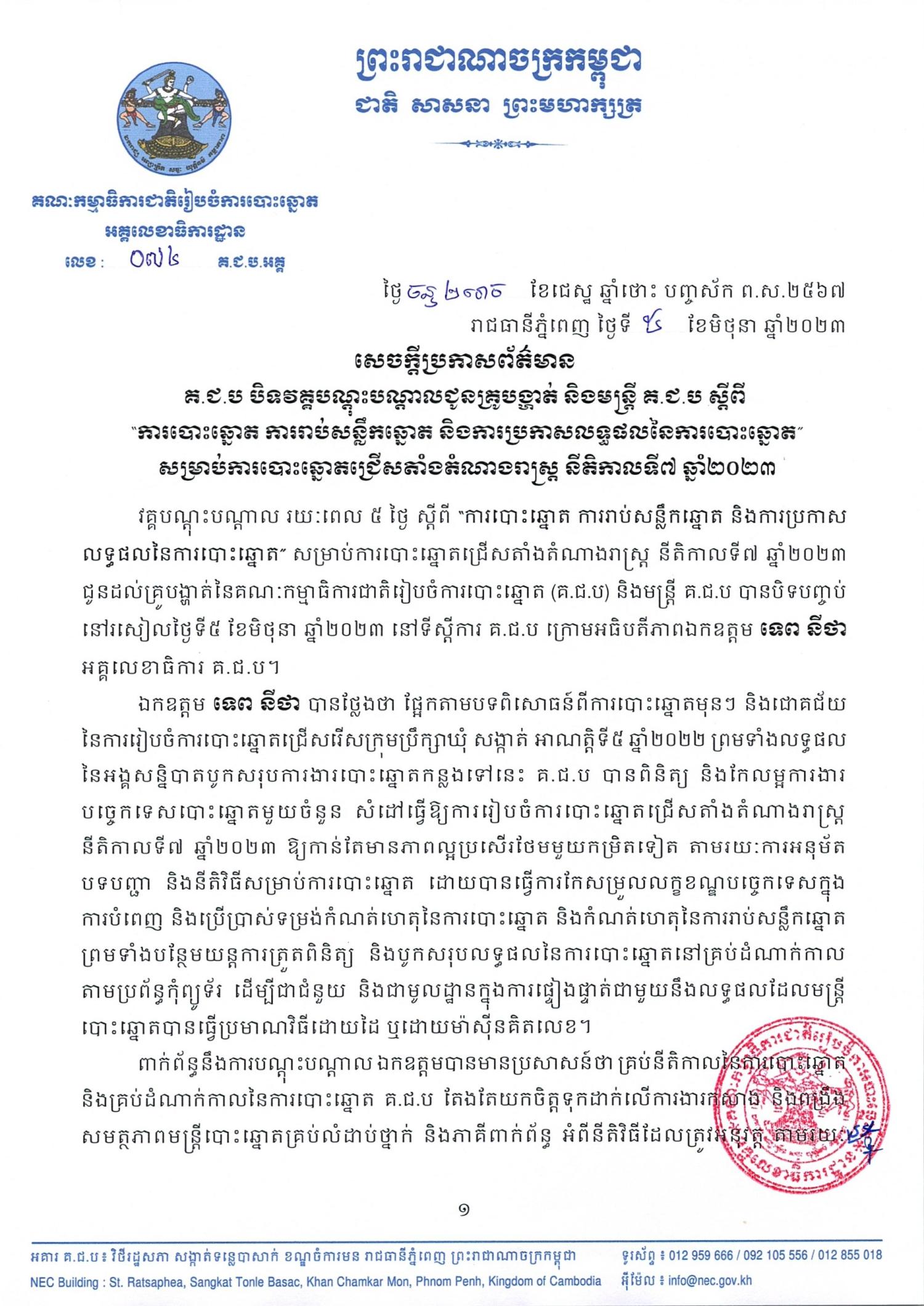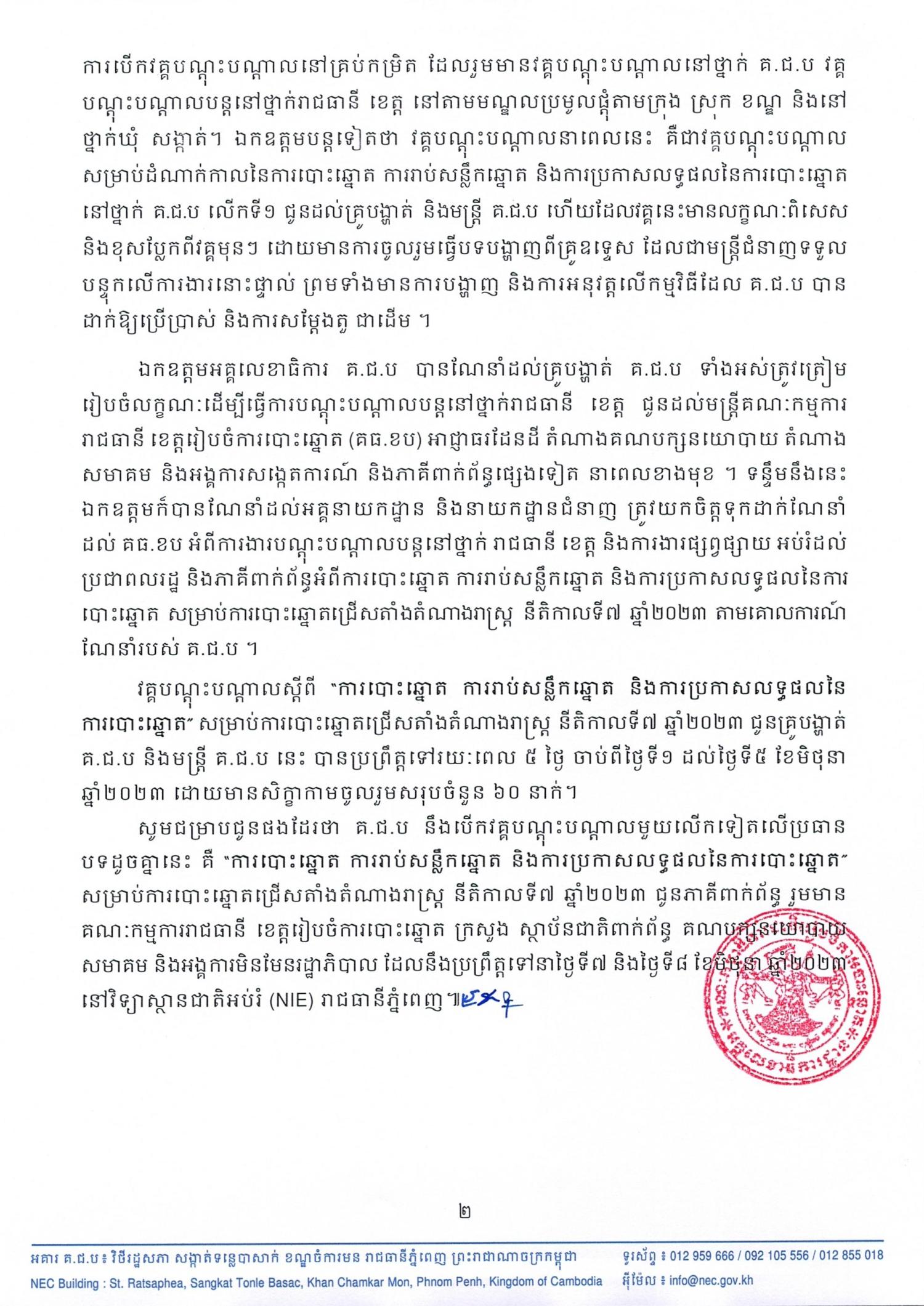 វគ្គបណ្ដុះបណ្ដាល រយៈពេល ៥ ថ្ងៃ ស្ដីពី “ការបោះឆ្នោត ការរាប់សន្លឹកឆ្នោត និងការប្រកាសលទ្ធផលនៃការបោះឆ្នោត” សម្រាប់ការបោះឆ្នោតជ្រើសតាំងតំណាងរាស្រ្ត នីតិកាលទី៧ ឆ្នាំ២០២៣ ជូនដល់គ្រូបង្ហាត់នៃគណៈកម្មាធិការជាតិរៀបចំការបោះឆ្នោត (គ.ជ.ប) និងមន្រ្តី គ.ជ.ប បានបិទបញ្ចប់នៅរសៀលថ្ងៃទី៥ ខែមិថុនា ឆ្នាំ២០២៣ នៅទីស្ដីការ គ.ជ.ប ក្រោមអធិបតីភាពឯកឧត្ដម ទេព នីថា អគ្គលេខាធិការ គ.ជ.ប។