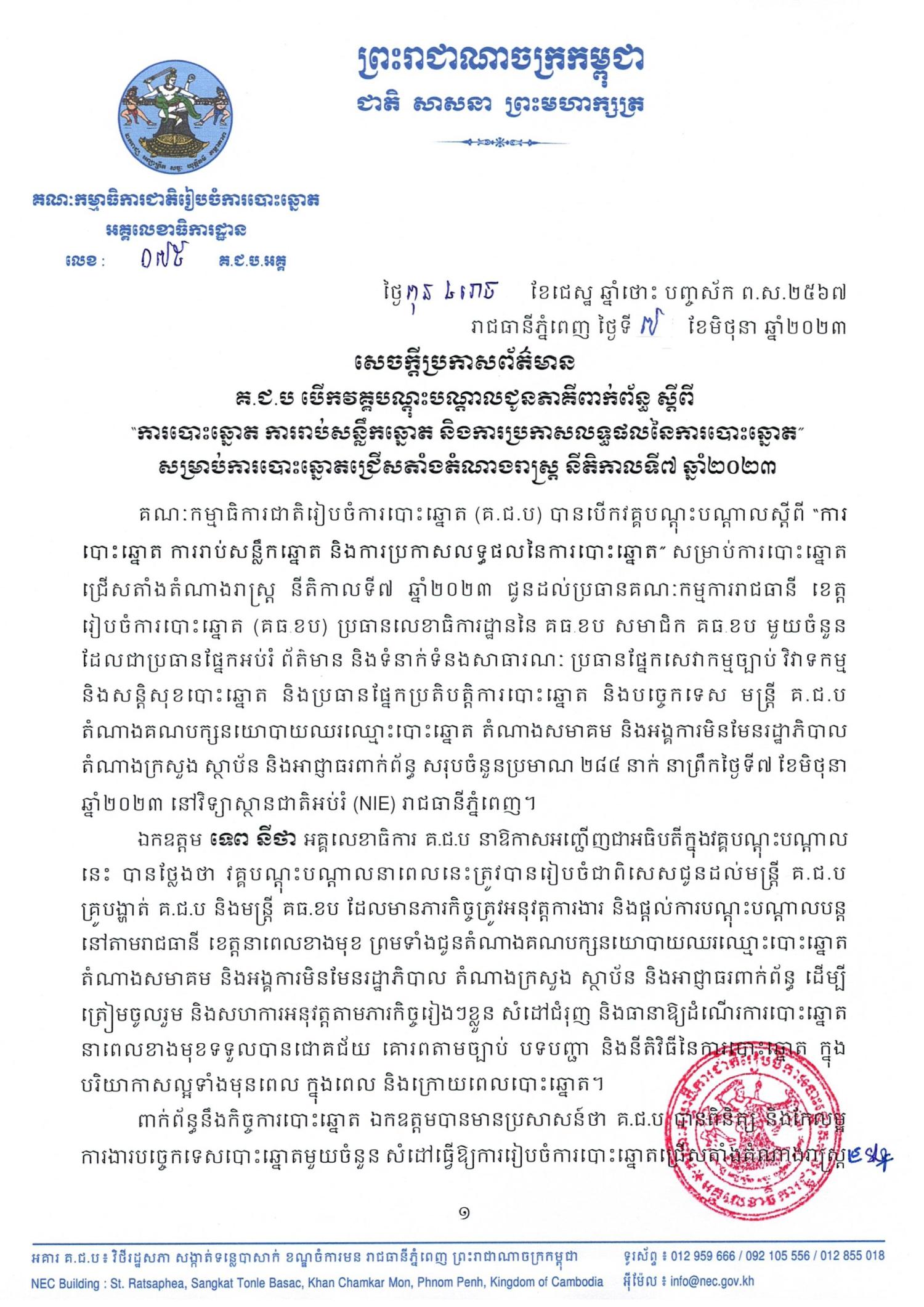 គណៈកម្មាធិការជាតិរៀបចំការបោះឆ្នោត (គ.ជ.ប) បានបើកវគ្គបណ្ដុះបណ្ដាលស្ដីពី “ការបោះឆ្នោត ការរាប់សន្លឹកឆ្នោត និងការប្រកាសលទ្ធផលនៃការបោះឆ្នោត” សម្រាប់ការបោះឆ្នោតជ្រើសតាំងតំណាងរាស្រ្ត នីតិកាលទី៧ ឆ្នាំ២០២៣ ជូនដល់ប្រធានគណៈកម្មការរាជធានី ខេត្តរៀបចំការបោះឆ្នោត (គធ.ខប) ប្រធានលេខាធិការដ្ឋាននៃ គធ.ខប សមាជិក គធ.ខប មួយចំនួន ដែលជាប្រធានផ្នែកអប់រំ ព័ត៌មាន និងទំនាក់ទំនងសាធារណៈ ប្រធានផ្នែកសេវាកម្មច្បាប់ វិវាទកម្ម និងសន្តិសុខបោះឆ្នោត និងប្រធានផ្នែកប្រតិបត្តិការបោះឆ្នោត និងបច្ចេកទេស មន្រ្តី គ.ជ.ប តំណាងគណបក្សនយោបាយឈរឈ្មោះបោះឆ្នោត តំណាងសមាគម និងអង្គការមិនមែនរដ្ឋាភិបាល តំណាងក្រសួង ស្ថាប័ន និងអាជ្ញាធរពាក់ព័ន្ធ សរុបចំនួនប្រមាណ ២៨៤ នាក់ នាព្រឹកថ្ងៃទី៧ ខែមិថុនា ឆ្នាំ២០២៣ នៅវិទ្យាស្ថានជាតិអប់រំ (NIE) រាជធានីភ្នំពេញ។