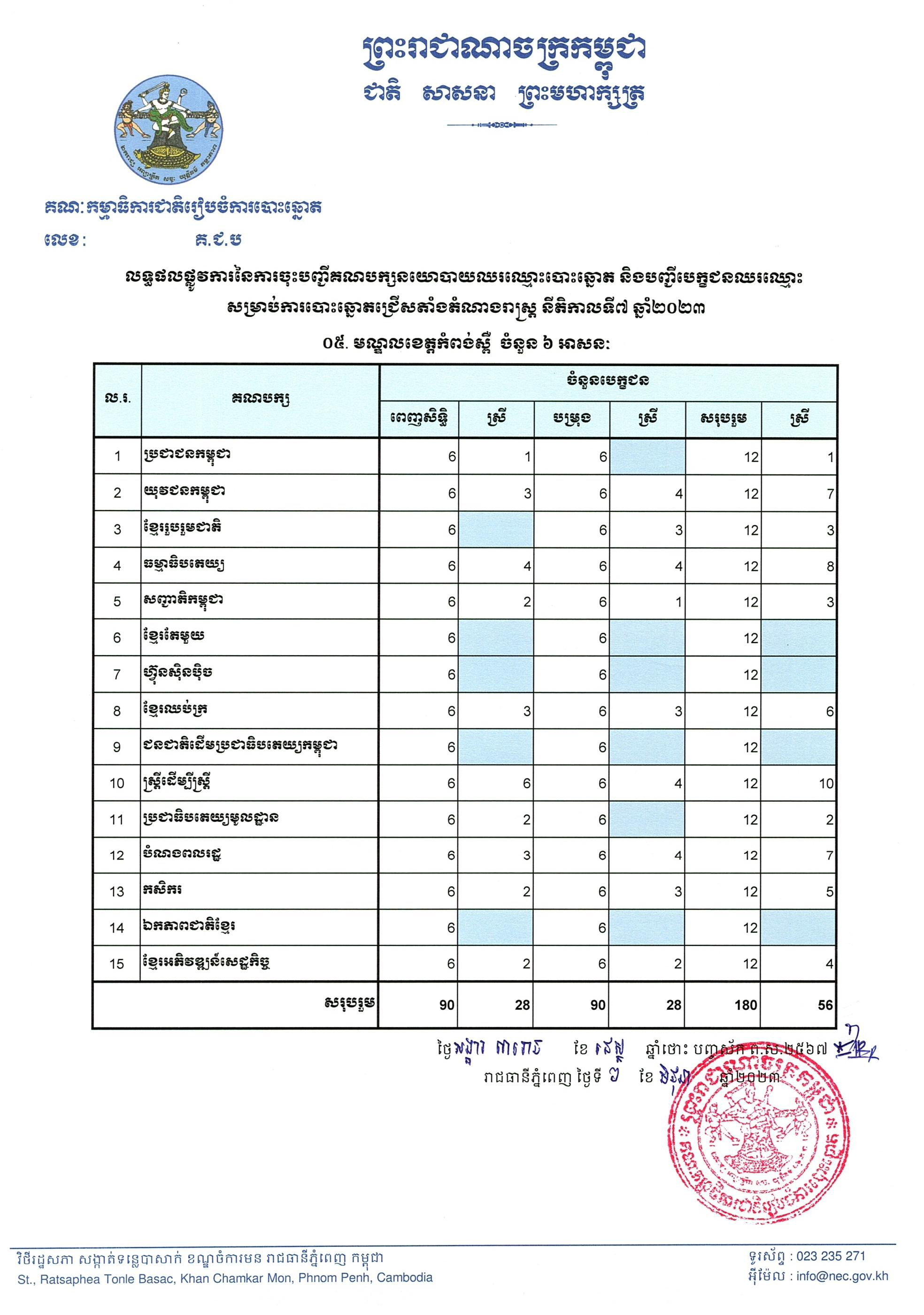លទ្ធផលផ្លូវការនៃការចុះបញ្ជីគណបក្សនយោបាយឈរឈ្មោះបោះឆ្នោត និងបញ្ជីបេក្ខជនឈរឈ្មោះ សម្រាប់ការបោះឆ្នោតជ្រើសតាំងតំណាងរាស្ត្រ នីតិកាលទី៧ ឆ្នាំ២០២៣ - ០៥. មណ្ឌលខេត្តកំពង់ស្ពឺ ចំនួន ៦ អាសនៈ