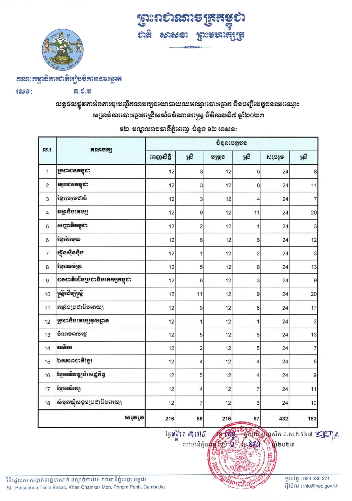 លទ្ធផលផ្លូវការនៃការចុះបញ្ជីគណបក្សនយោបាយឈរឈ្មោះបោះឆ្នោត និងបញ្ជីបេក្ខជនឈរឈ្មោះ សម្រាប់ការបោះឆ្នោតជ្រើសតាំងតំណាងរាស្ត្រ នីតិកាលទី៧ ឆ្នាំ២០២៣ - ១២. មណ្ឌលរាជធានីភ្នំពេញ ចំនួន ១២ អាសនៈ