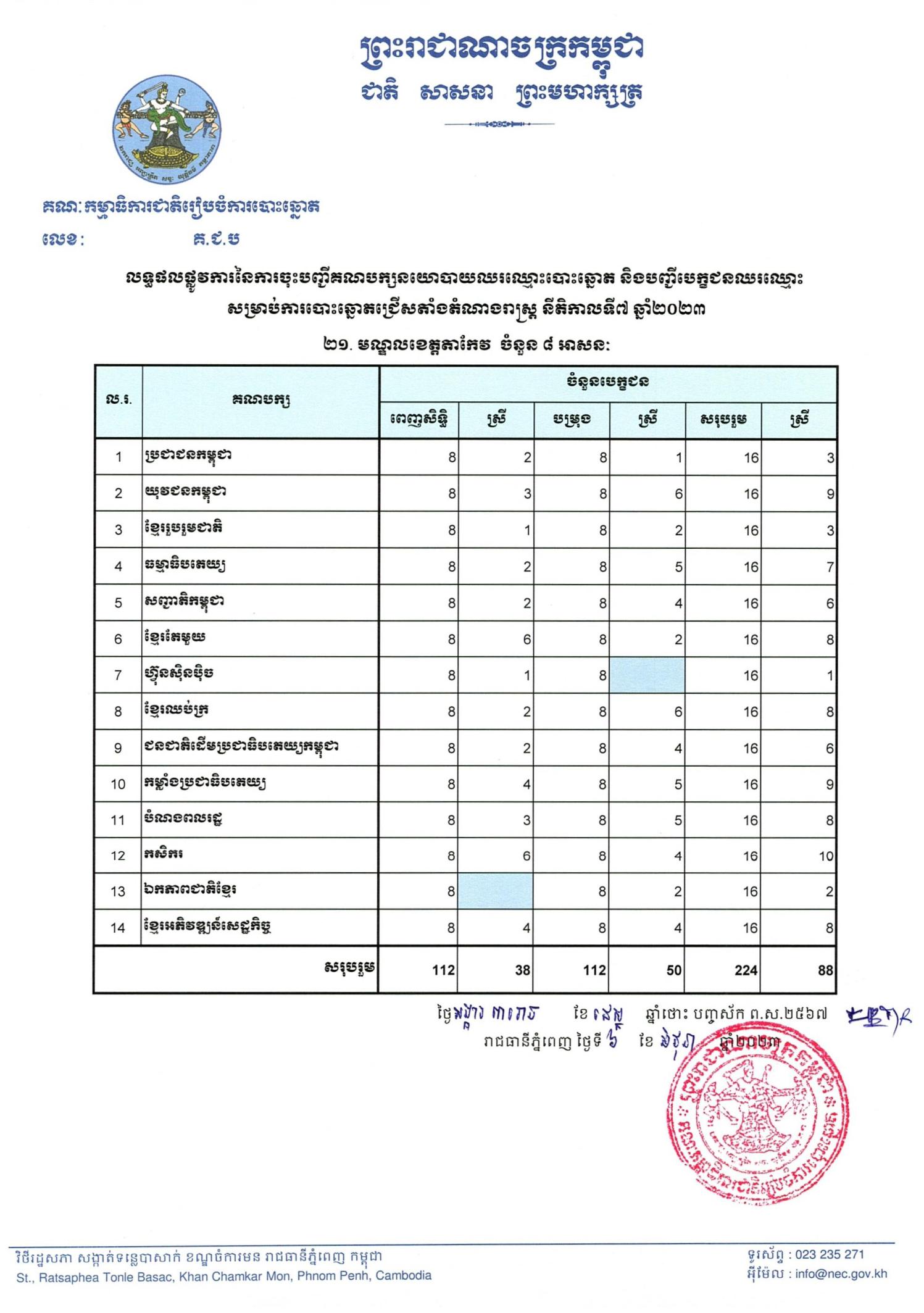លទ្ធផលផ្លូវការនៃការចុះបញ្ជីគណបក្សនយោបាយឈរឈ្មោះបោះឆ្នោត និងបញ្ជីបេក្ខជនឈរឈ្មោះ សម្រាប់ការបោះឆ្នោតជ្រើសតាំងតំណាងរាស្ត្រ នីតិកាលទី៧ ឆ្នាំ២០២៣ - ២១. មណ្ឌលខេត្តតាកែវ ចំនួន ៨ អាសនៈ