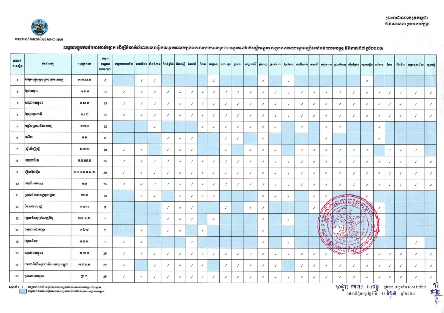 លទ្ធផលផ្លូវការនៃការចាប់ឆ្នោត ដើម្បីកំណត់លំដាប់លេខរៀងគណបក្សនយោបាយឈរឈ្មោះបោះឆ្នោតនៅលើសន្លឹកឆ្នោត សម្រាប់ការបោះឆ្នោតជ្រើសតាំងតំណាងរាស្ត្រ នីតិកាលទី៧ ឆ្នាំ២០២៣