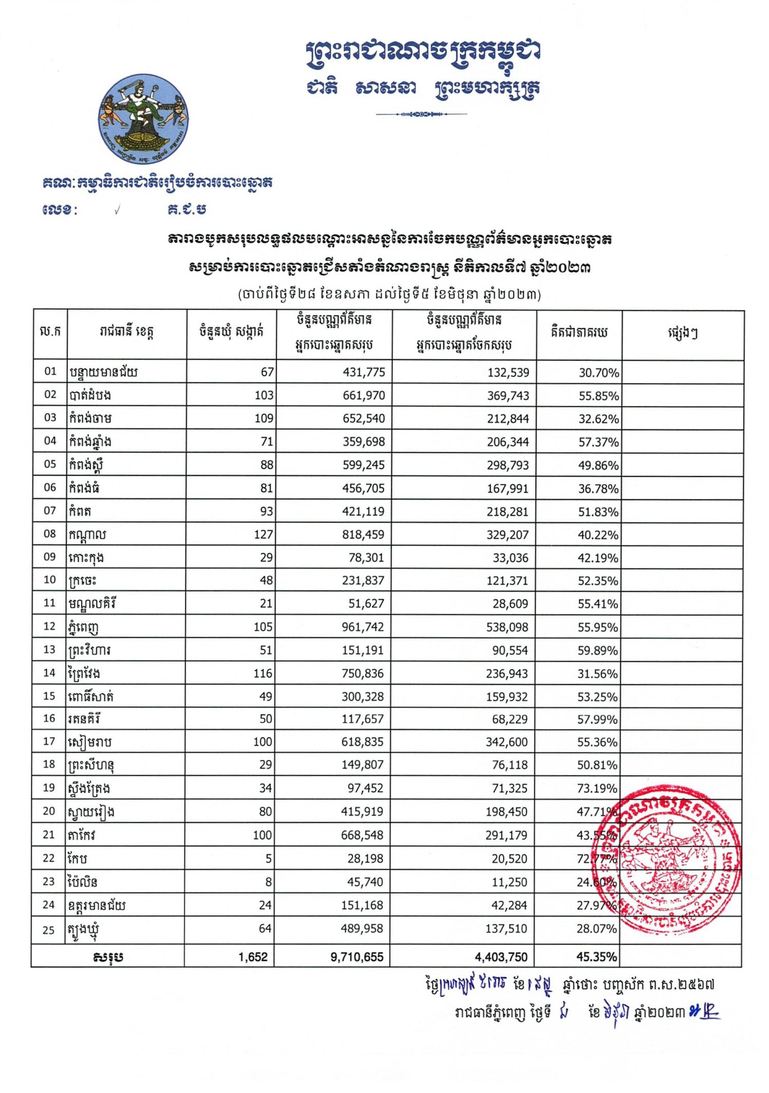 តារាងបូកសរុបលទ្ធផលបណ្ដោះអាសន្ននៃការចែកបណ្ណព័ត៌មានអ្នកបោះឆ្នោត សម្រាប់ការបោះឆ្នោតជ្រើសតាំងតំណាងរាស្ត្រ នីតិកាលទី៧ ឆ្នាំ២០២៣ ចាប់ពីថ្ងៃទី២៨ ខែឧសភា ដល់ថ្ងៃទី៥ ខែមិថុនា ឆ្នាំ២០២៣