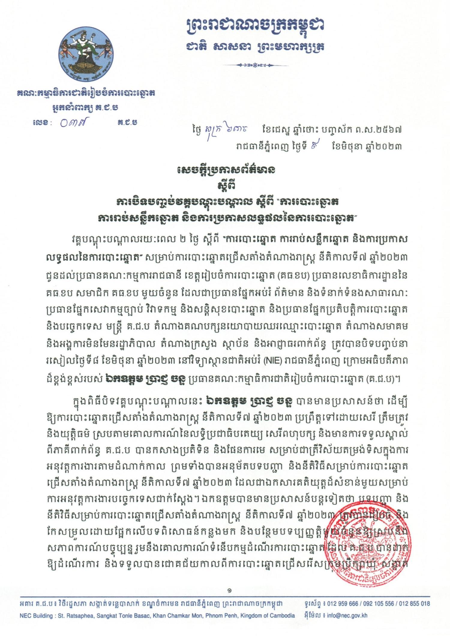 សេចក្តីប្រកាសព័ត៌មានរបស់អ្នកនាំពាក្យ គ.ជ.ប លេខ ០៣៧ គ.ជ.ប ស្តីពី ការបិទបញ្ចប់វគ្គបណ្ដុះបណ្ដាល ស្ដីពី “ការបោះឆ្នោត ការរាប់សន្លឹកឆ្នោត និងការប្រកាសលទ្ធផលនៃការបោះឆ្នោត”