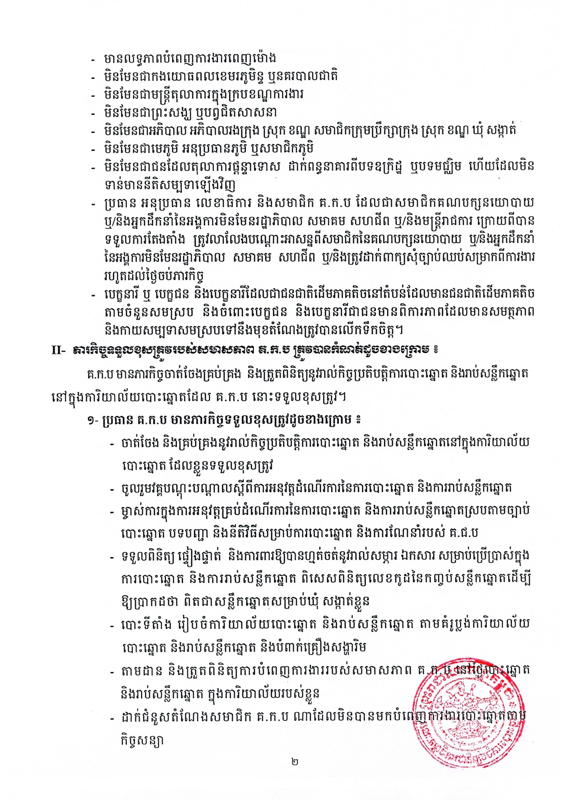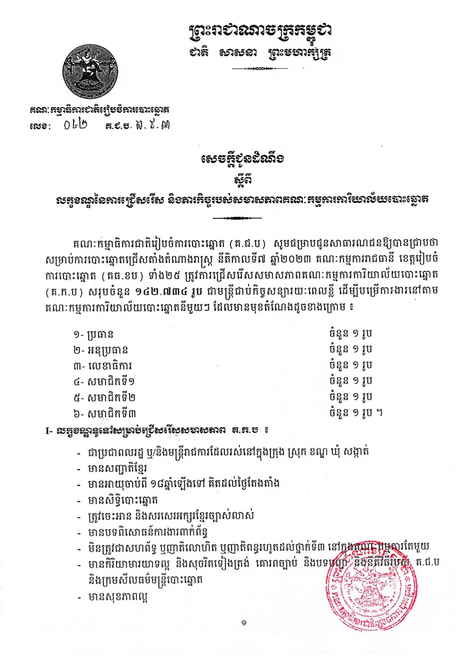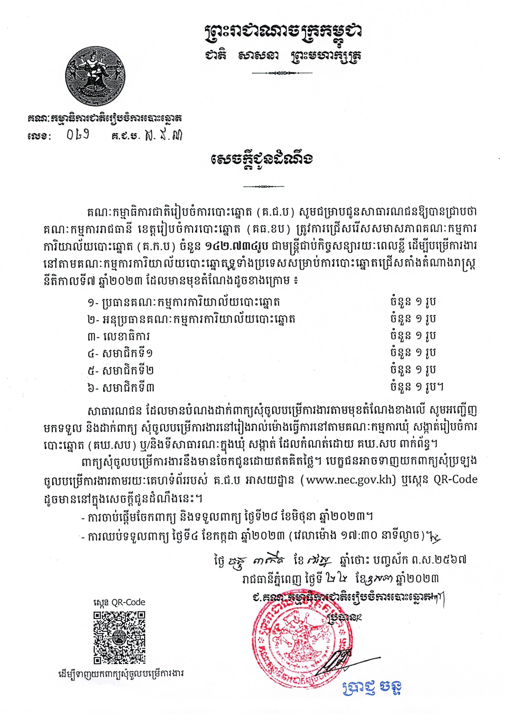 សេចក្តីជូនដំណឹង ស្តីពីការជ្រើសរើសសមាសភាពគណ:កម្មការការិយាល័យបោះឆ្នោត (គ.ក.ប) សម្រាប់ការបោះឆ្នោតជ្រើសតាំងតំណាងរាស្រ្ត នីតិកាលទី៧ ឆ្នាំ២០២៣