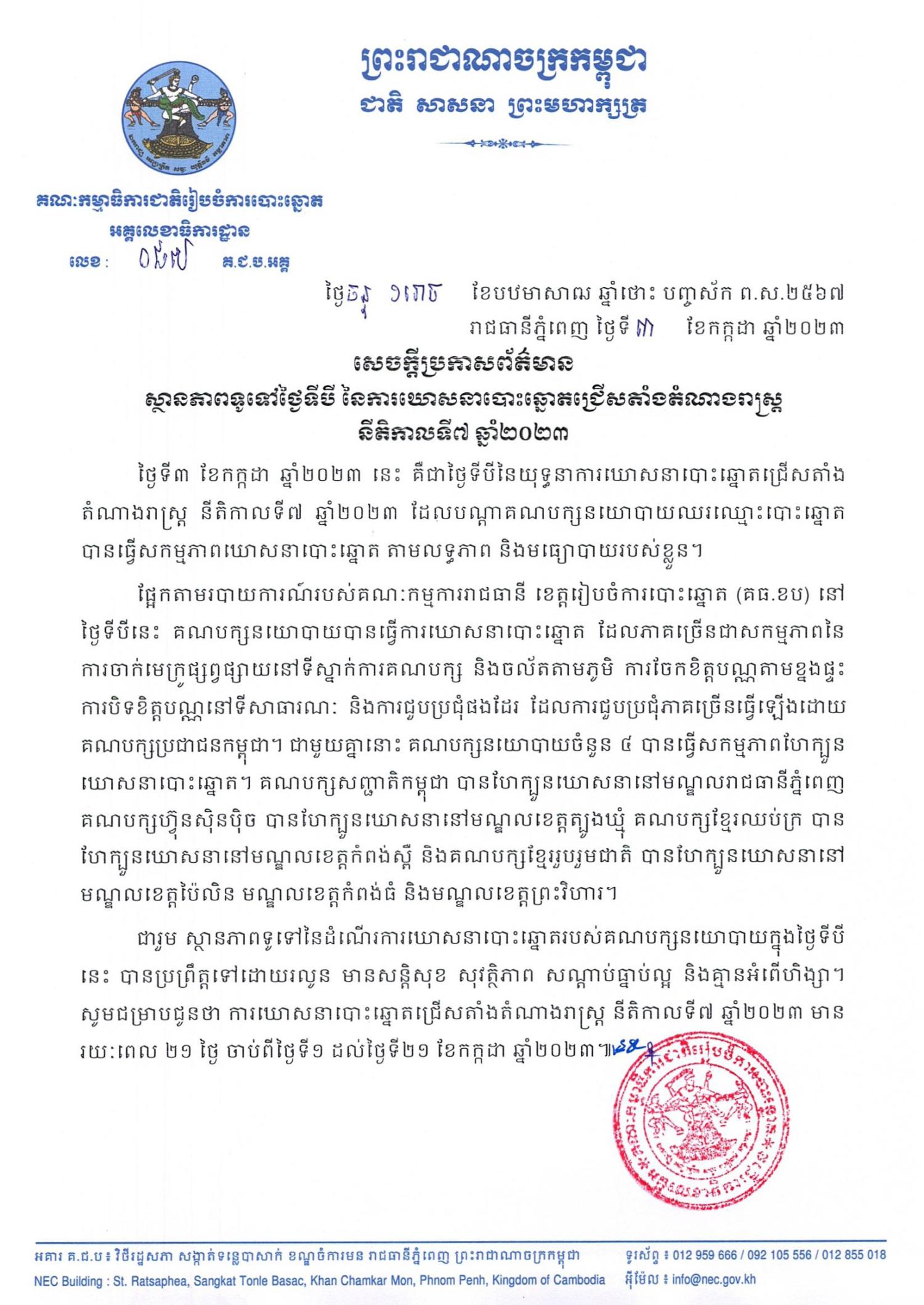 ជារួម ស្ថានភាពទូទៅនៃដំណើរការឃោសនាបោះឆ្នោតរបស់គណបក្សនយោបាយក្នុងថ្ងៃទីបីនេះ បានប្រព្រឹត្តទៅដោយរលូន មានសន្តិសុខ សុវត្ថិភាព សណ្ដាប់ធ្នាប់ល្អ និងគ្មានអំពើហិង្សា។ សូមជម្រាបជូនថា ការឃោសនាបោះឆ្នោតជ្រើសតាំងតំណាងរាស្រ្ត នីតិកាលទី៧ ឆ្នាំ២០២៣ មានរយៈពេល ២១ ថ្ងៃ ចាប់ពីថ្ងៃទី១ ដល់ថ្ងៃទី២១ ខែកក្កដា ឆ្នាំ២០២៣៕