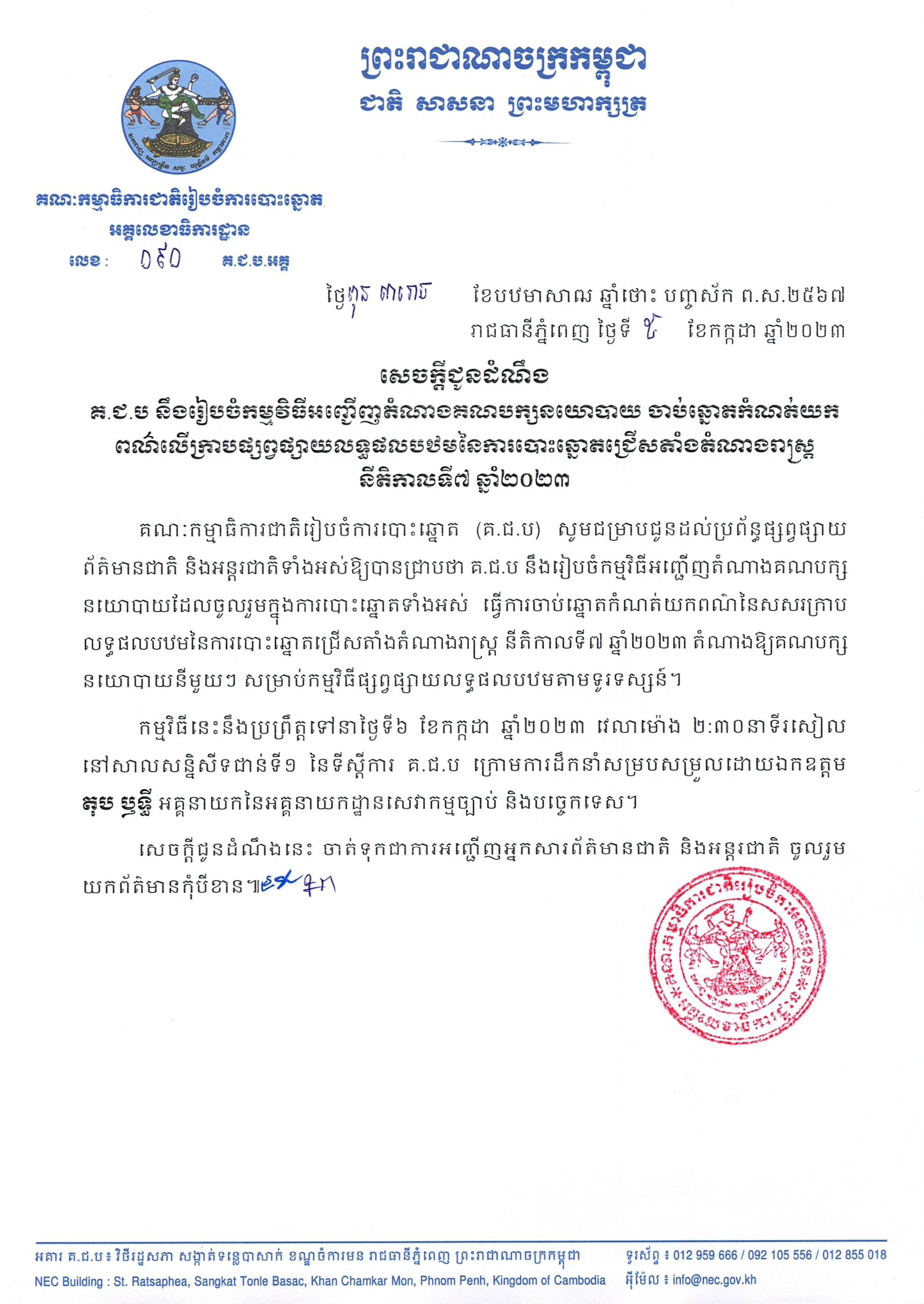 គណៈកម្មាធិការជាតិរៀបចំការបោះឆ្នោត (គ.ជ.ប) សូមជម្រាបជូនដល់ប្រព័ន្ធផ្សព្វផ្សាយព័ត៌មានជាតិ និងអន្តរជាតិទាំងអស់ឱ្យបានជ្រាបថា គ.ជ.ប នឹងរៀបចំកម្មវិធីអញ្ជើញតំណាងគណបក្សនយោបាយដែលចូលរួមក្នុងការបោះឆ្នោតទាំងអស់ ធ្វើការចាប់ឆ្នោតកំណត់យកពណ៌នៃសសរក្រាប លទ្ធផលបឋមនៃការបោះឆ្នោតជ្រើសតាំងតំណាងរាស្រ្ត នីតិកាលទី៧ ឆ្នាំ២០២៣ តំណាងឱ្យគណបក្សនយោបាយនីមួយៗ សម្រាប់កម្មវិធីផ្សព្វផ្សាយលទ្ធផលបឋមតាមទូរទស្សន៍។