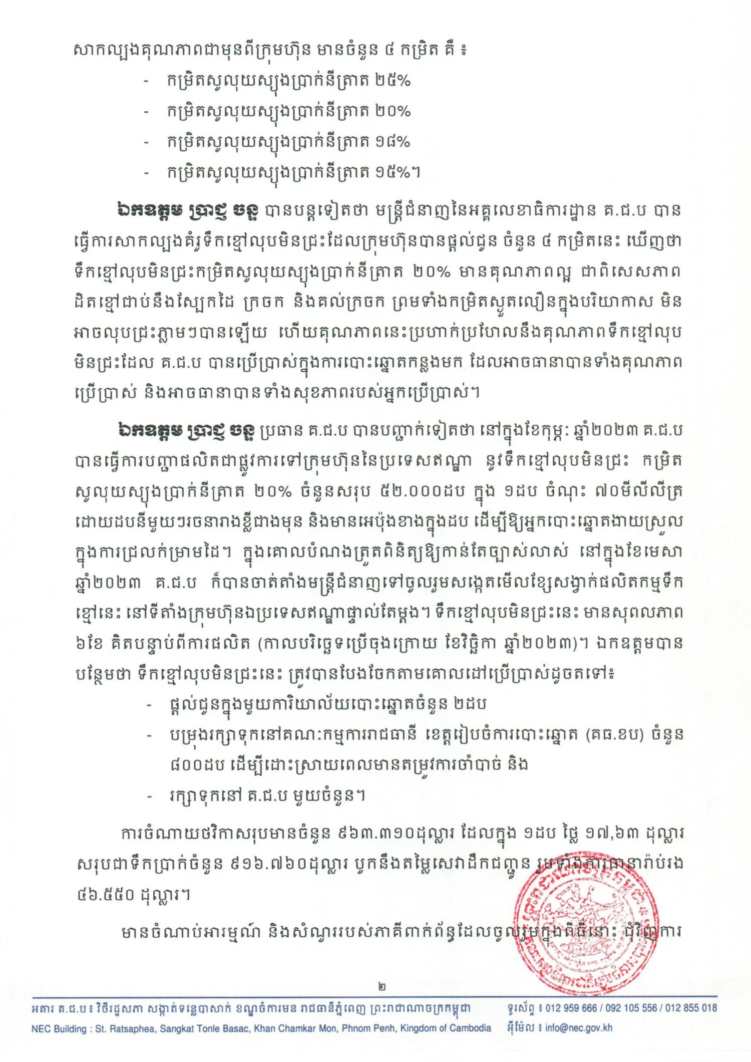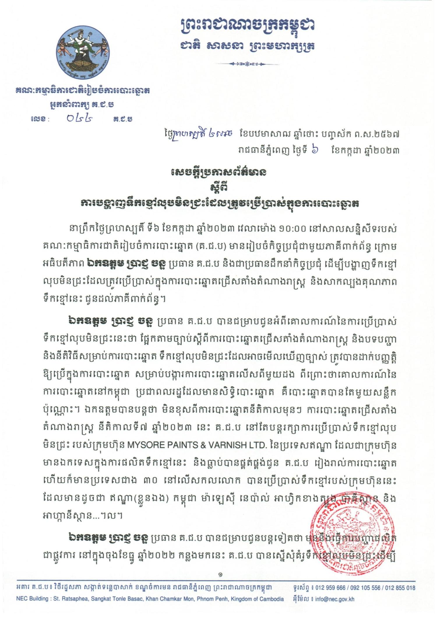 នាព្រឹកថ្ងៃព្រហស្បតិ៍ ទី៦ ខែកក្កដា ឆ្នាំ២០២៣ វេលាម៉ោង ១០:០០ នៅសាលសន្និសីទរបស់ គណៈកម្មាធិការជាតិរៀបចំការបោះឆ្នោត (គ.ជ.ប) មានរៀបចំកិច្ចប្រជុំជាមួយភាគីពាក់ព័ន្ធ ក្រោម អធិបតីភាព ឯកឧត្ដម ប្រាជ្ញ ចន្ទ ប្រធាន គ.ជ.ប និងជាប្រធានដឹកនាំកិច្ចប្រជុំ ដើម្បីបង្ហាញទឹកខ្មៅលុបមិនជ្រះដែលត្រូវប្រើប្រាស់ក្នុងការបោះឆ្នោតជ្រើសតាំងតំណាងរាស្ត្រ និងសាកល្បងគុណភាព ទឹកខ្មៅនេះ ជូនដល់ភាគីពាក់ព័ន្ធ។