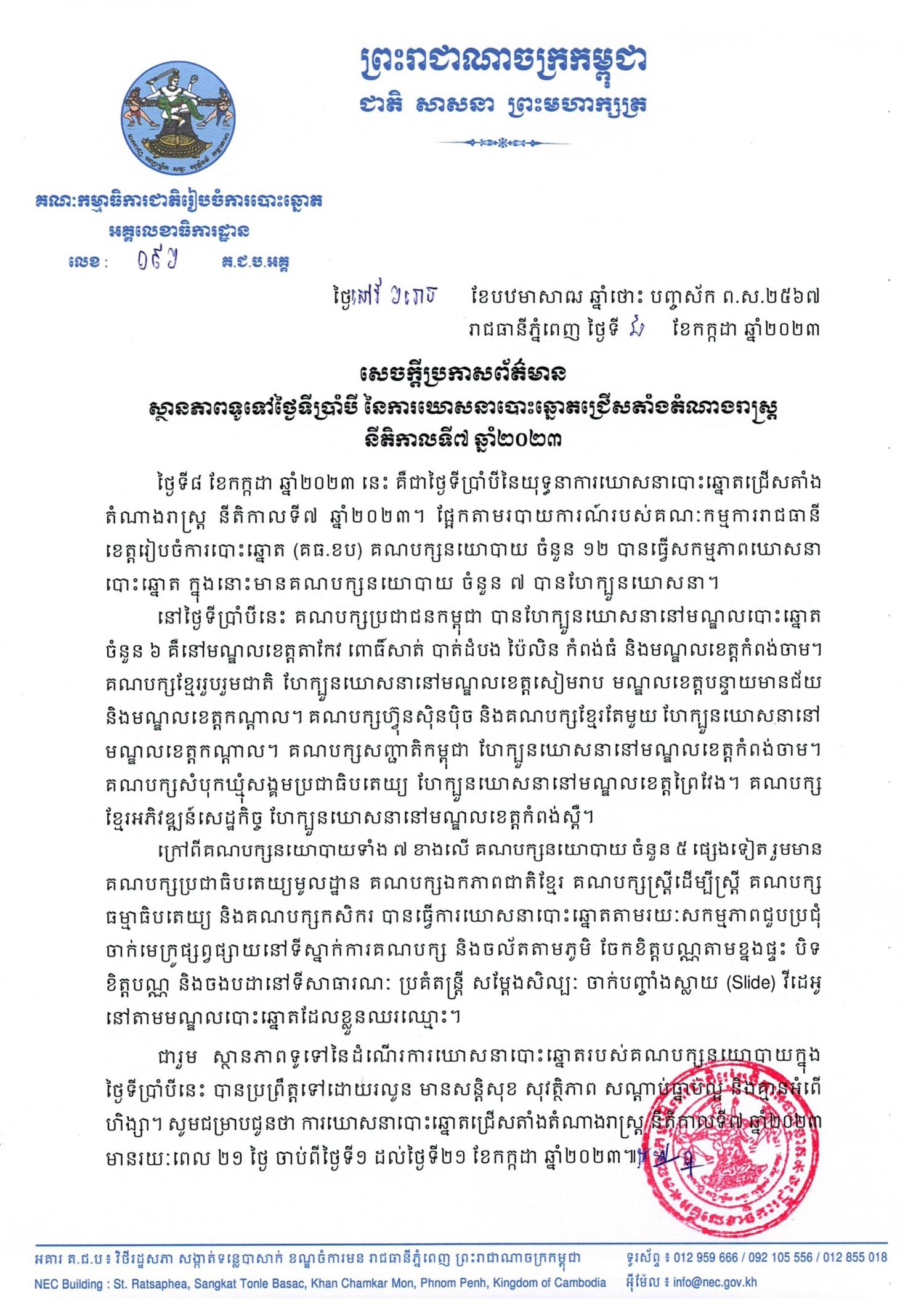 ជារួម ស្ថានភាពទូទៅនៃដំណើរការឃោសនាបោះឆ្នោតរបស់គណបក្សនយោបាយក្នុងថ្ងៃទីប្រាំបីនេះ បានប្រព្រឹត្តទៅដោយរលូន មានសន្តិសុខ សុវត្ថិភាព សណ្ដាប់ធ្នាប់ល្អ និងគ្មានអំពើហិង្សា។ សូមជម្រាបជូនថា ការឃោសនាបោះឆ្នោតជ្រើសតាំងតំណាងរាស្រ្ត នីតិកាលទី៧ ឆ្នាំ២០២៣ មានរយៈពេល ២១ ថ្ងៃ ចាប់ពីថ្ងៃទី១ ដល់ថ្ងៃទី២១ ខែកក្កដា ឆ្នាំ២០២៣៕
