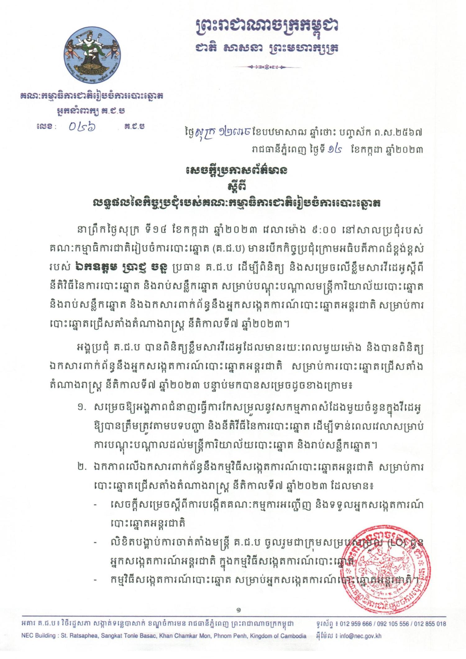 អង្គប្រជុំ គ.ជ.ប បានពិនិត្យខ្លឹមសារវីដេអូដែលមានរយៈពេលមួយម៉ោង និងបានពិនិត្យ ឯកសារពាក់ព័ន្ធនឹងអ្នកសង្កេតការណ៍បោះឆ្នោតអន្តរជាតិ សម្រាប់ការបោះឆ្នោតជ្រើសតាំងតំណាងរាស្រ្ត នីតិកាលទី៧ ឆ្នាំ២០២៣ បន្ទាប់មកបានសម្រេចដូចខាងក្រោម៖