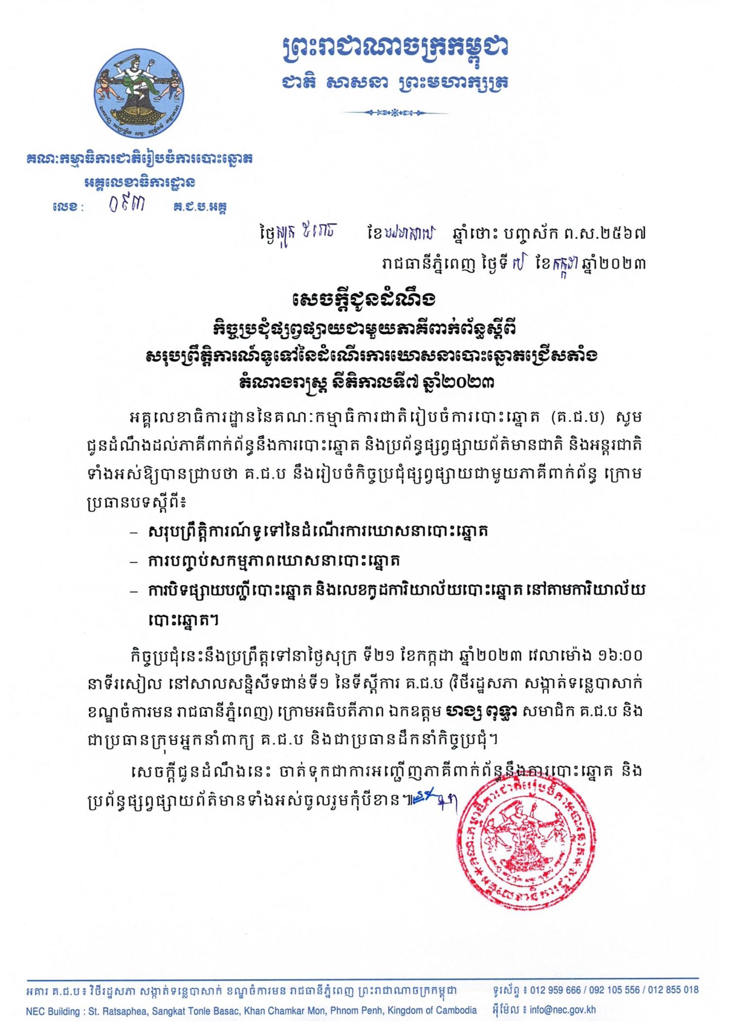 កិច្ចប្រជុំនេះនឹងប្រព្រឹត្តទៅនាថ្ងៃសុក្រ ទី២១ ខែកក្កដា ឆ្នាំ២០២៣ វេលាម៉ោង ១៦:០០នាទីរសៀល នៅសាលសន្និសីទជាន់ទី១ នៃទីស្តីការ គ.ជ.ប (វិថីរដ្ឋសភា សង្កាត់ទន្លេបាសាក់ ខណ្ឌចំការមន រាជធានីភ្នំពេញ) ក្រោមអធិបតីភាព ឯកឧត្តម ហង្ស ពុទ្ធា សមាជិក គ.ជ.ប និងជាប្រធានក្រុមអ្នកនាំពាក្យ គ.ជ.ប និងជាប្រធានដឹកនាំកិច្ចប្រជុំ។