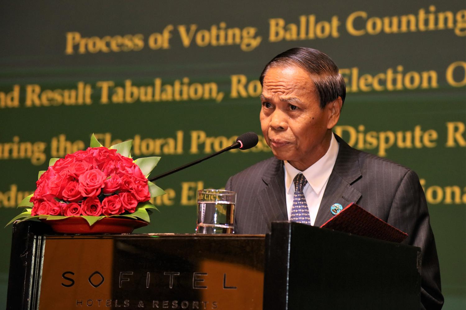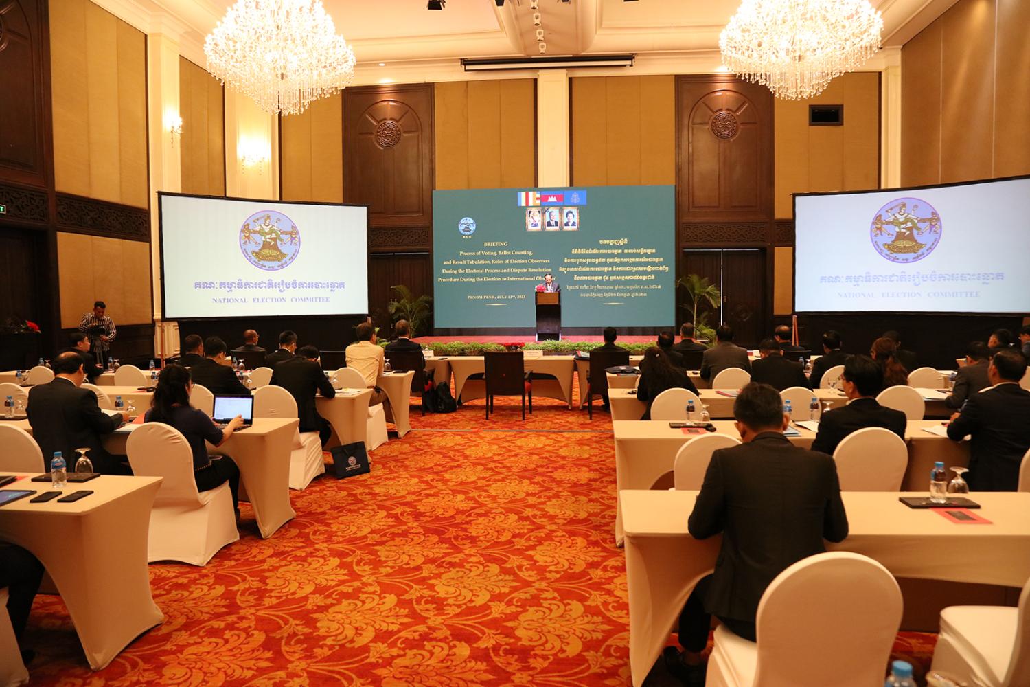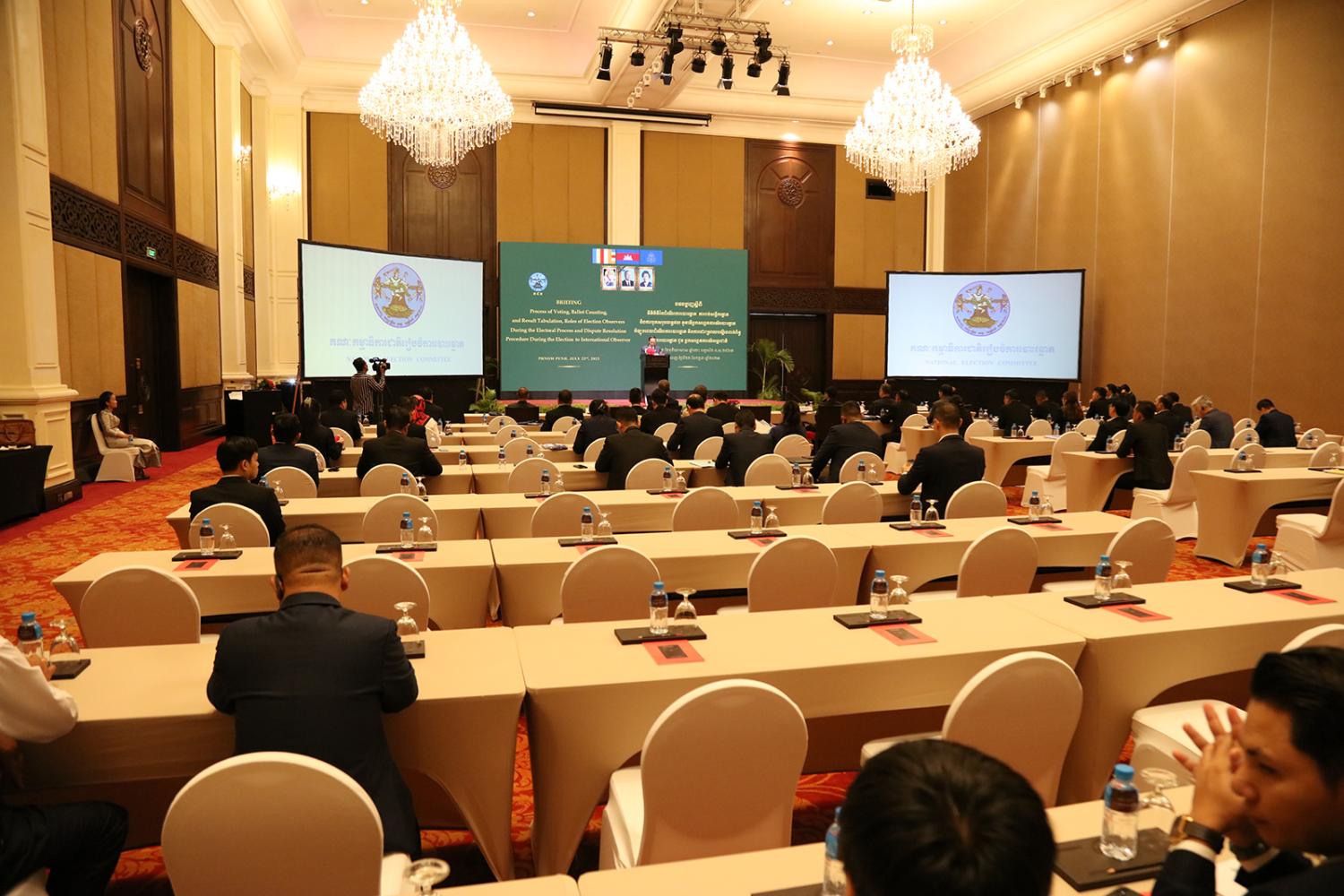 រូបភាពសកម្មភាព ឯកឧត្តម នុត សុខុម អនុប្រធាន គ.ជ.ប អញ្ជើញជាអធិបតី ក្នុងកម្មវិធីរៀបចំបទបង្ហាញ ស្តីពីនីតិវិធីនៃដំណើរការបោះឆ្នោត ការរាប់សន្លឹកឆ្នោត និងការបូកសរុបលទ្ធផល តួនាទីអ្នកសង្កេតការណ៍បោះឆ្នោត អំឡុងពេលដំណើរការបោះឆ្នោត និងការដោះស្រាយពាក្យបណ្តឹងពាក់ព័ន្ធនឹងការបោះឆ្នោត ជូនអ្នកសង្កេតការណ៍អន្តរជាតិ នៅសណ្ឋាគារសូហ្វីតែល រាជធានីភ្នំពេញ នាព្រឹកថ្ងៃទី២២ ខែកក្កដា ឆ្នាំ២០២៣។