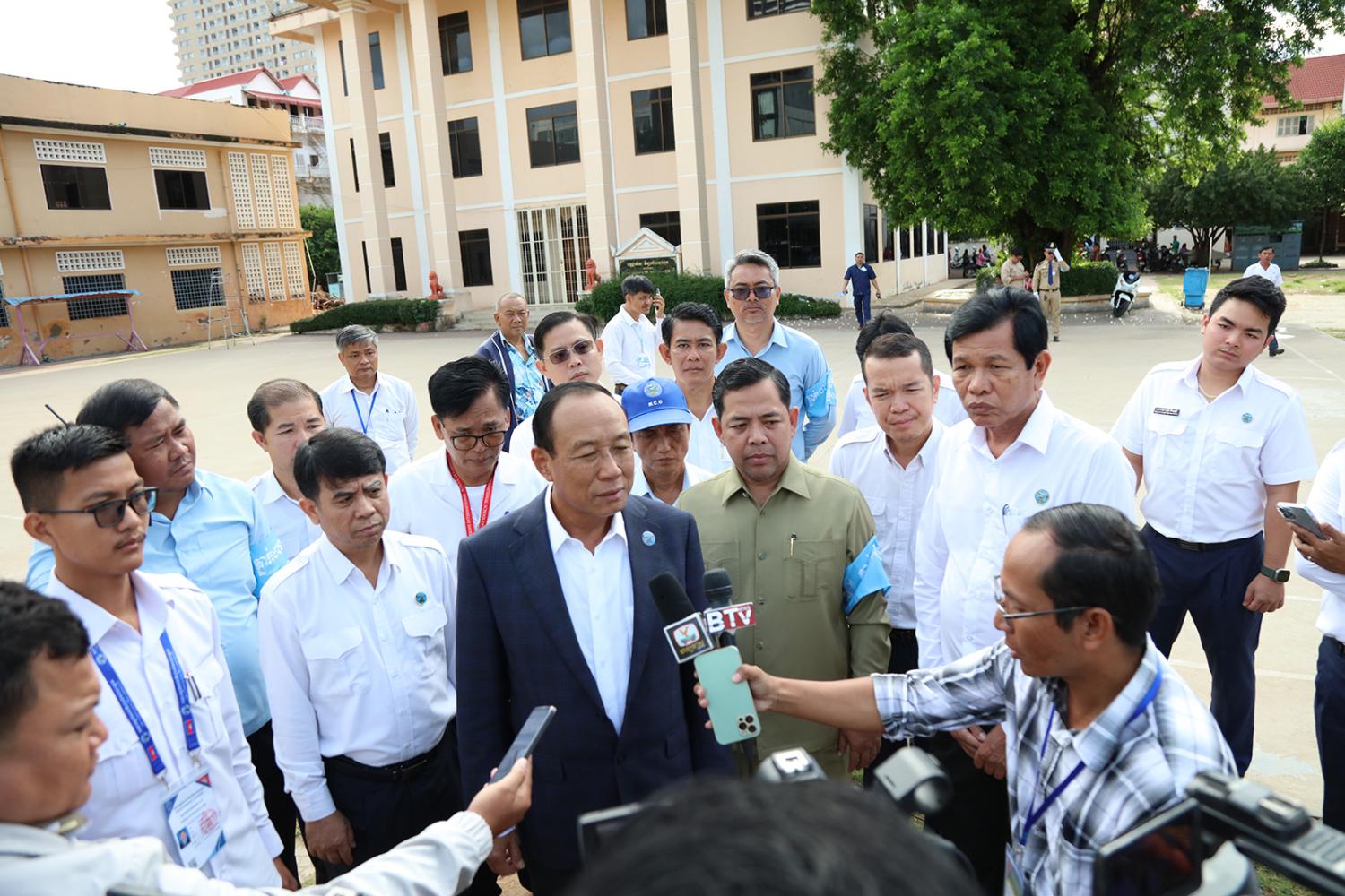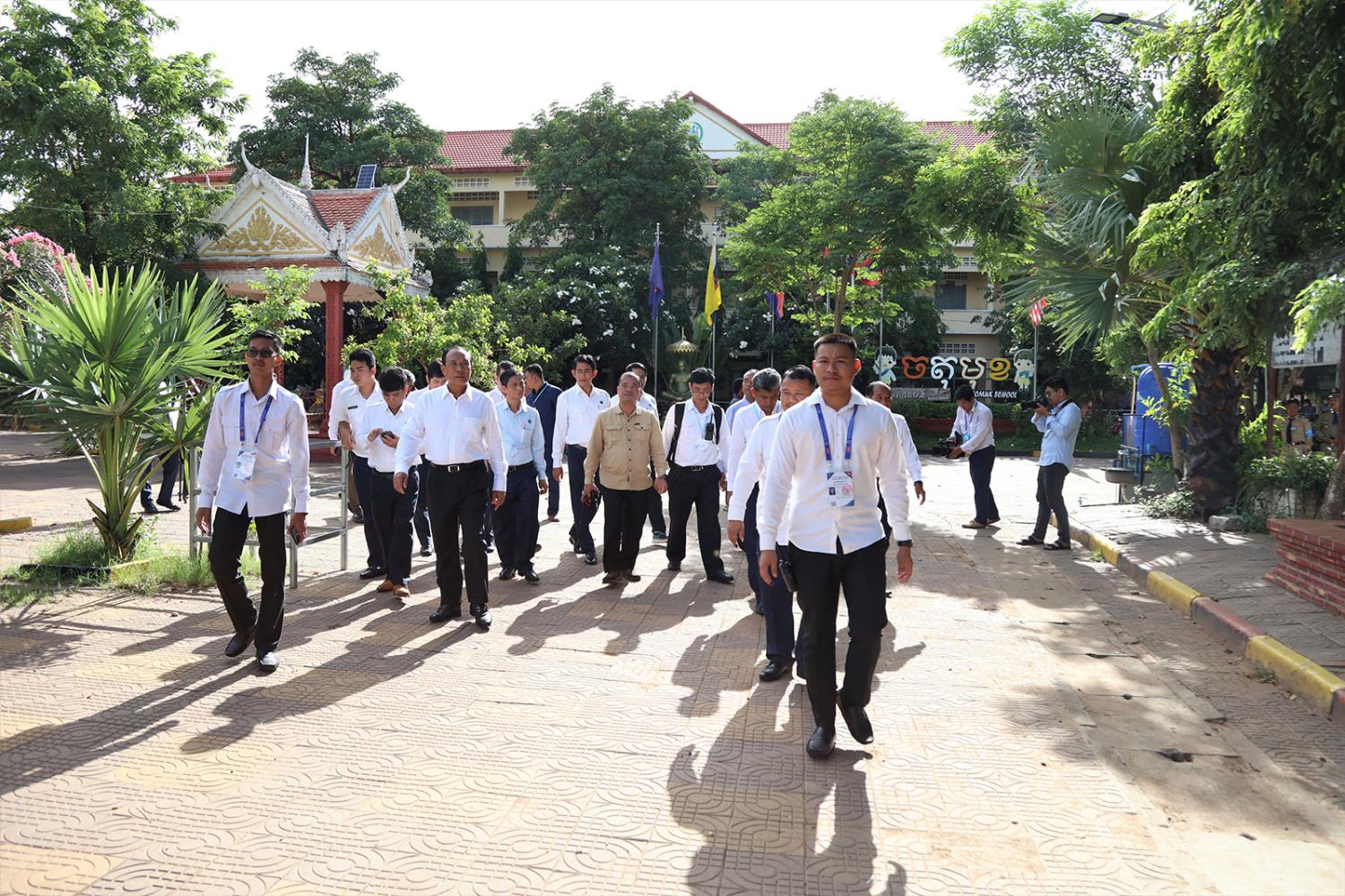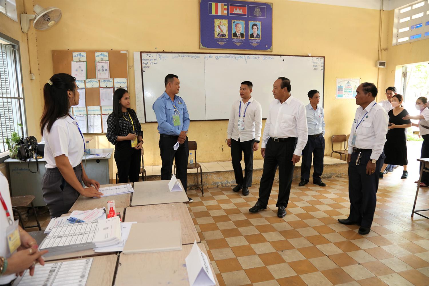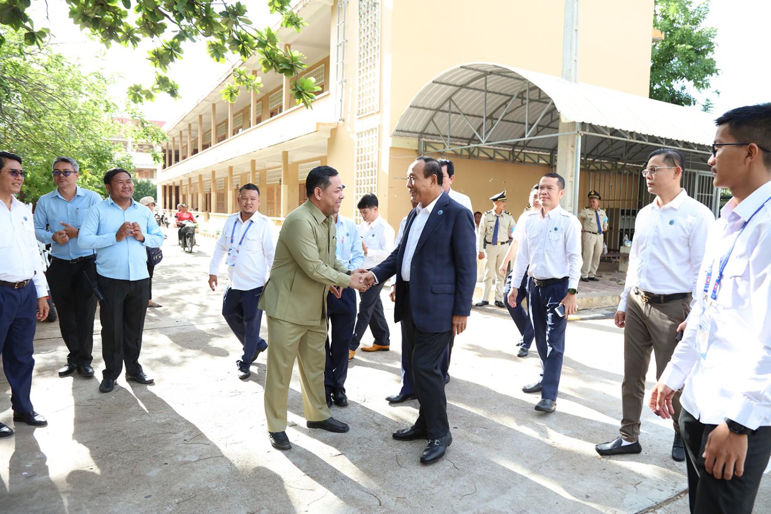 រូបភាពសកម្មភាព ឯកឧត្ដម ប្រាជ្ញ ចន្ទ ប្រធាន គ.ជ.ប បានអញ្ជើញចុះត្រួតពិនិត្យការិយាល័យបោះឆ្នោត នៅវិទ្យាល័យបាក់ទូក ក្នុងសង្កាត់វាលវង់ ខណ្ឌ៧មករា និងអនុវិទ្យាល័យចតុមុខ ក្នុងសង្កាត់ជ័យជំនះ ខណ្ឌដូនពេញ ក្នុងមណ្ឌលរាជធានីភ្នំពេញ នាព្រឹកថ្ងៃទី២៣ ខែកក្កដា ឆ្នាំ២០២៣