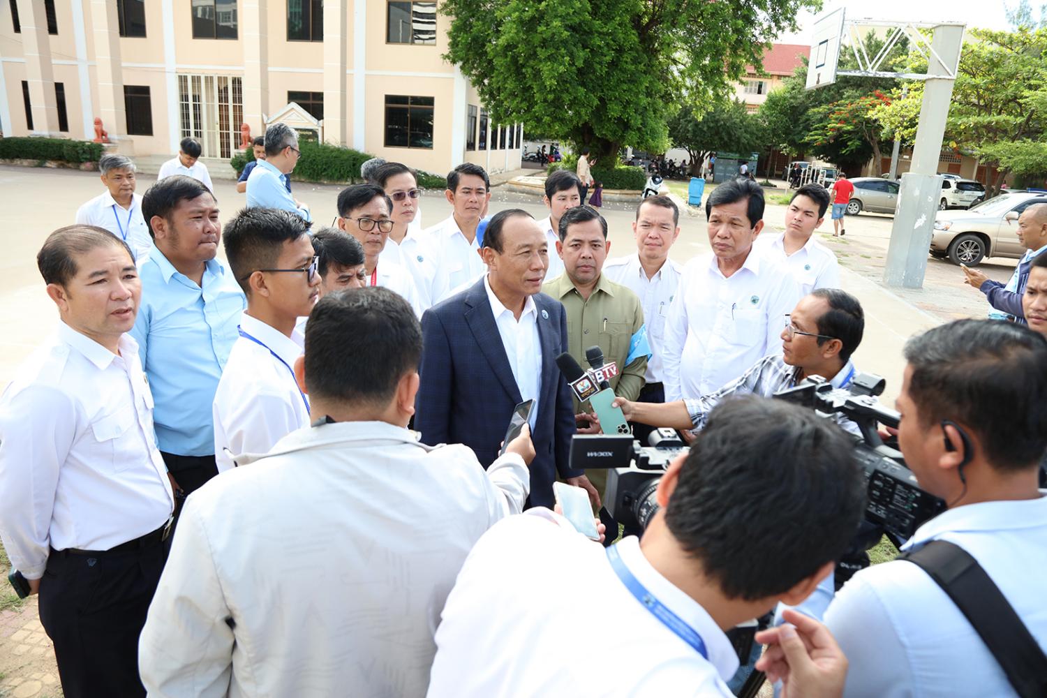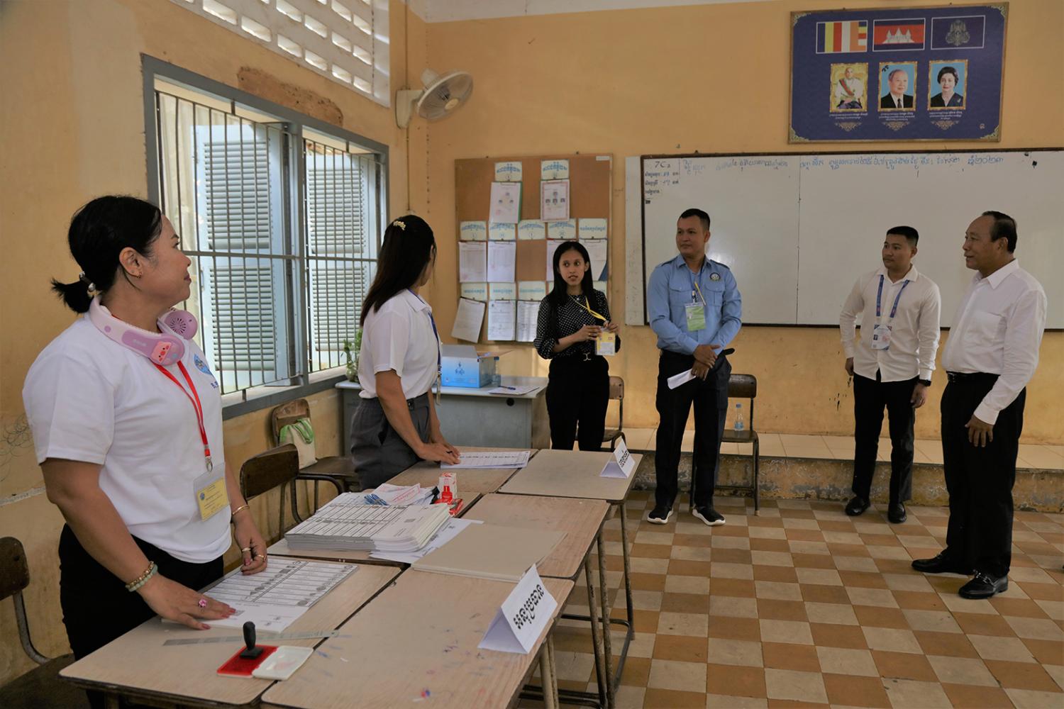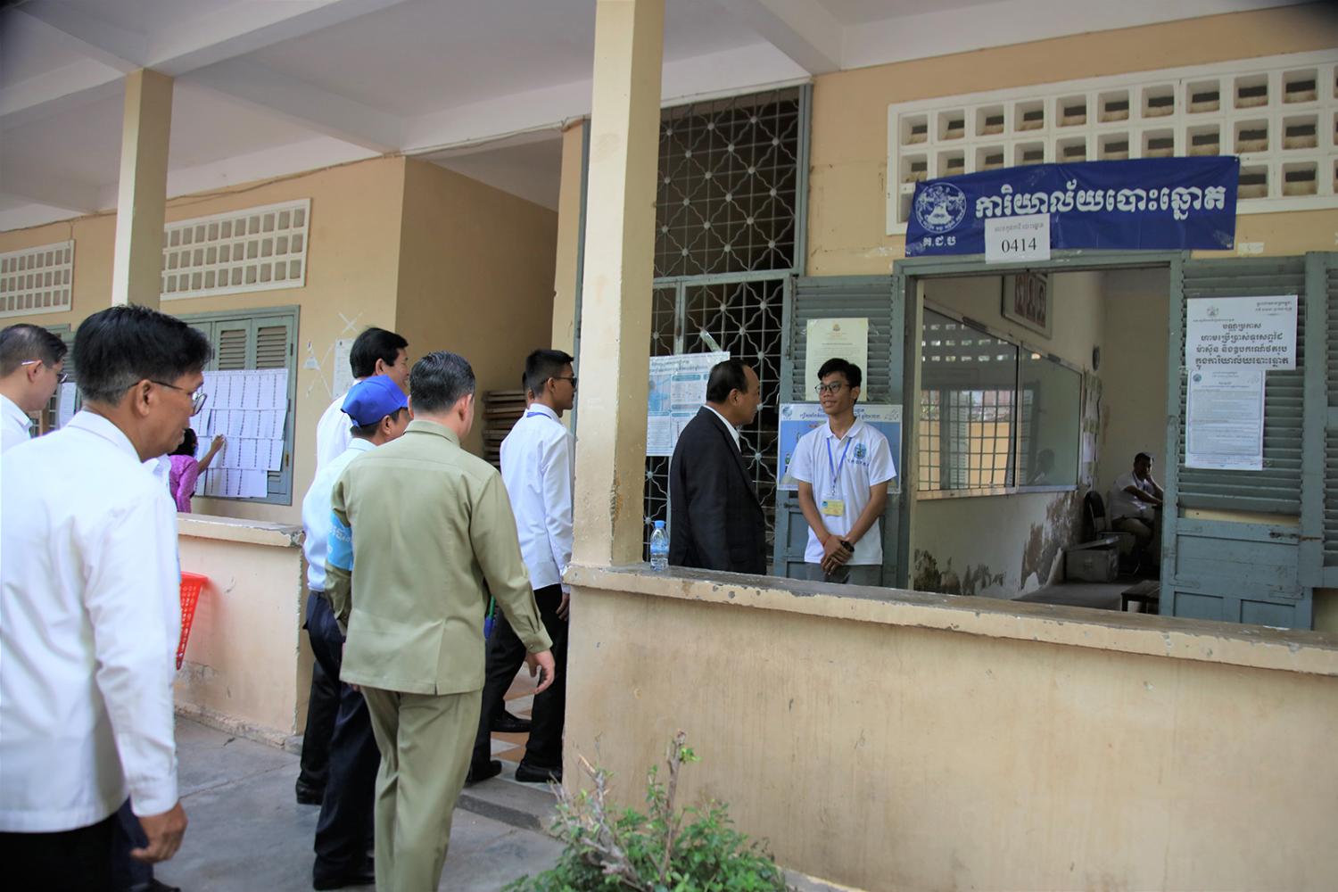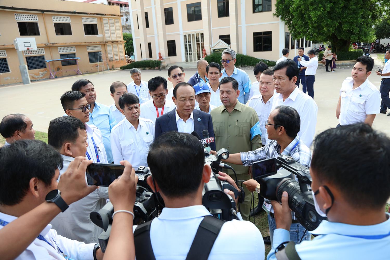 រូបភាពសកម្មភាព ឯកឧត្ដម ប្រាជ្ញ ចន្ទ ប្រធាន គ.ជ.ប បានអញ្ជើញចុះត្រួតពិនិត្យការិយាល័យបោះឆ្នោត នៅវិទ្យាល័យបាក់ទូក ក្នុងសង្កាត់វាលវង់ ខណ្ឌ៧មករា និងអនុវិទ្យាល័យចតុមុខ ក្នុងសង្កាត់ជ័យជំនះ ខណ្ឌដូនពេញ ក្នុងមណ្ឌលរាជធានីភ្នំពេញ នាព្រឹកថ្ងៃទី២៣ ខែកក្កដា ឆ្នាំ២០២៣