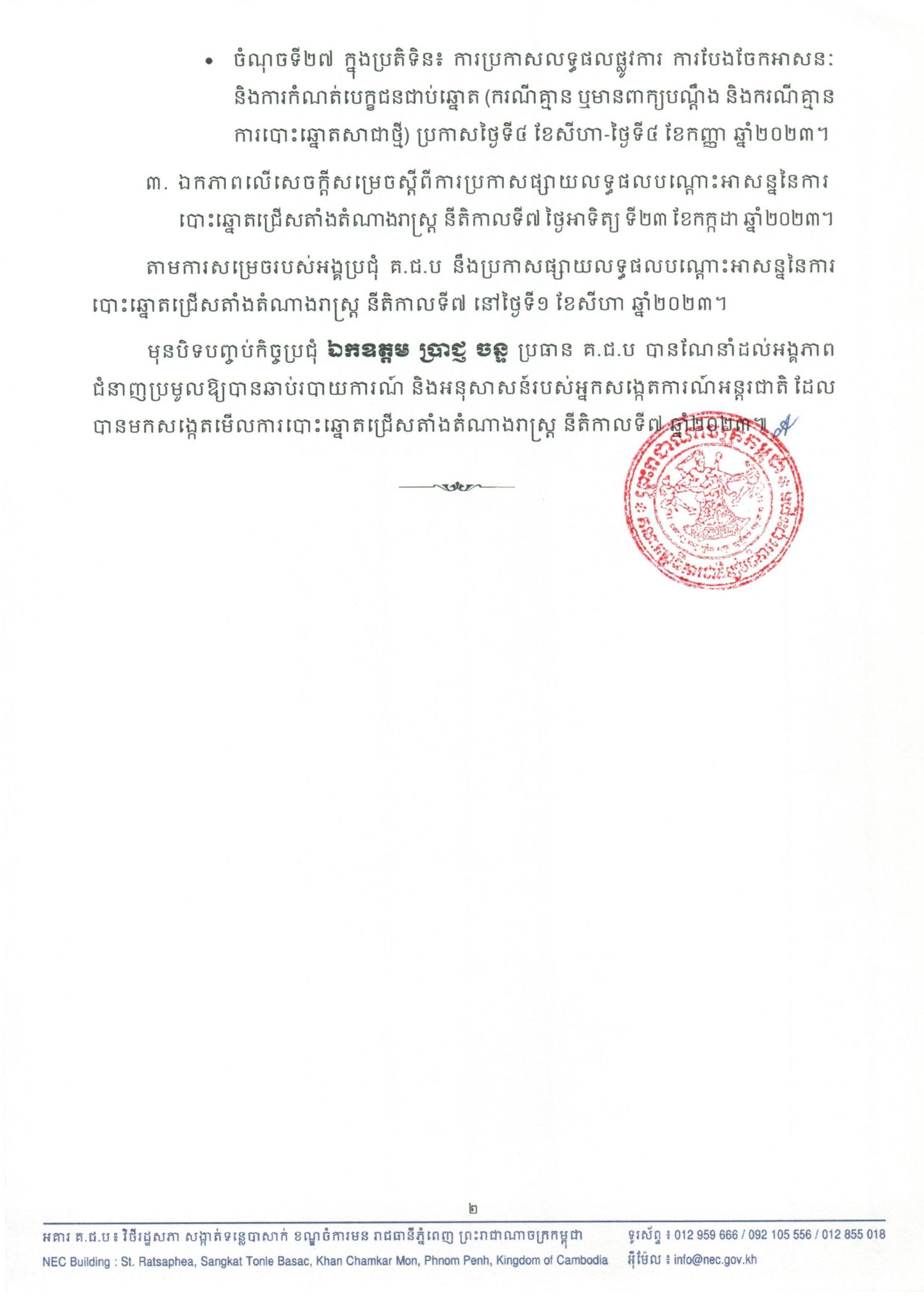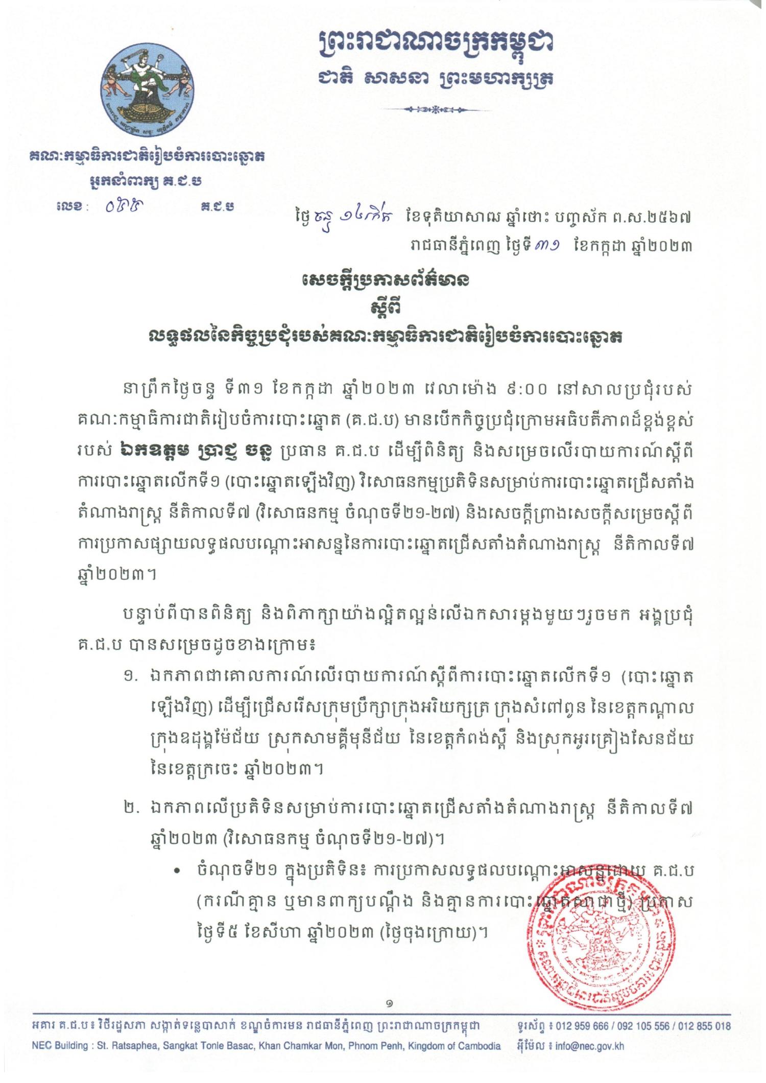 តាមការសម្រេចរបស់អង្គប្រជុំ គ.ជ.ប នឹងប្រកាសផ្សាយលទ្ធផលបណ្តោះអាសន្ននៃការបោះឆ្នោតជ្រើសតាំងតំណាងរាស្រ្ត នីតិកាលទី៧ នៅថ្ងៃទី១ ខែសីហា ឆ្នាំ២០២៣។