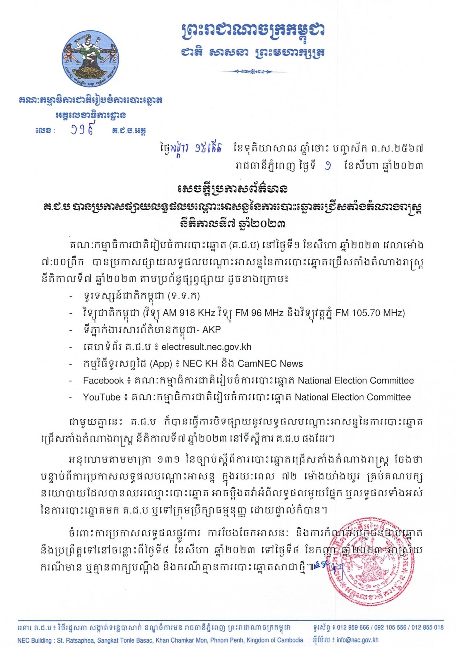 គណៈកម្មាធិការជាតិរៀបចំការបោះឆ្នោត (គ.ជ.ប) នៅថ្ងៃទី១ ខែសីហា ឆ្នាំ២០២៣ វេលាម៉ោង ៧:០០ព្រឹក បានប្រកាសផ្សាយលទ្ធផលបណ្ដោះអាសន្ននៃការបោះឆ្នោតជ្រើសតាំងតំណាងរាស្រ្ត នីតិកាលទី៧ ឆ្នាំ២០២៣ តាមប្រព័ន្ធផ្សព្វផ្សាយ ដូចខាងក្រោម៖