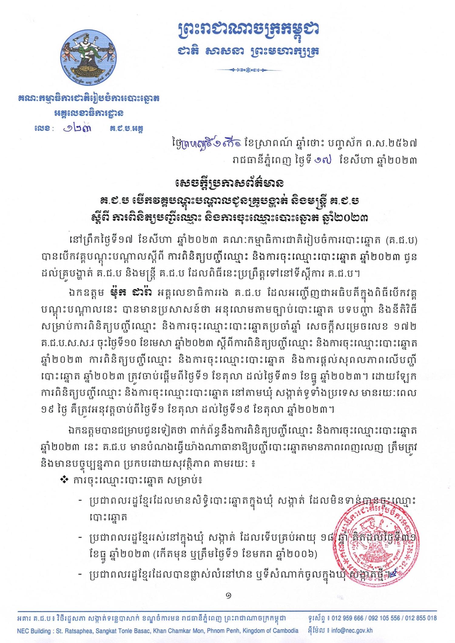 នៅព្រឹកថ្ងៃទី១៧ ខែសីហា ឆ្នាំ២០២៣ គណៈកម្មាធិការជាតិរៀបចំការបោះឆ្នោត (គ.ជ.ប) បានបើកវគ្គបណ្ដុះបណ្ដាលស្ដីពី ការពិនិត្យបញ្ជីឈ្មោះ និងការចុះឈ្មោះបោះឆ្នោត ឆ្នាំ២០២៣ ជូនដល់គ្រូបង្ហាត់ គ.ជ.ប និងមន្រ្តី គ.ជ.ប ដែលពិធីនេះប្រព្រឹត្តទៅនៅទីស្ដីការ គ.ជ.ប។