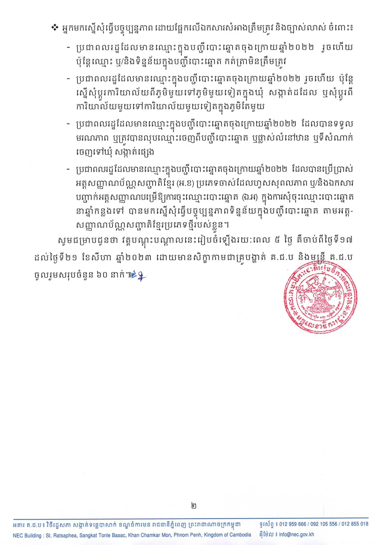 - ប្រជាពលរដ្ឋដែលមានឈ្មោះក្នុងបញ្ជីបោះឆ្នោតចុងក្រោយឆ្នាំ២០២២ ដែលបានប្រើប្រាស់អត្តសញ្ញាណប័ណ្ណសញ្ជាតិខ្មែរ (អ.ខ) ប្រភេទចាស់ដែលហួសសុពលភាព ឬ/និងឯកសារបញ្ជាក់អត្តសញ្ញាណបម្រើឱ្យការចុះឈ្មោះបោះឆ្នោត (ឯ.អ) ក្នុងការសុំចុះឈ្មោះបោះឆ្នោតនាឆ្នាំកន្លងទៅ បានមកស្នើសុំធ្វើបច្ចុប្បន្នភាពទិន្នន័យក្នុងបញ្ជីបោះឆ្នោត តាមអត្ត-សញ្ញាណប័ណ្ណសញ្ជាតិខ្មែរប្រភេទថ្មីរបស់ខ្លួន។